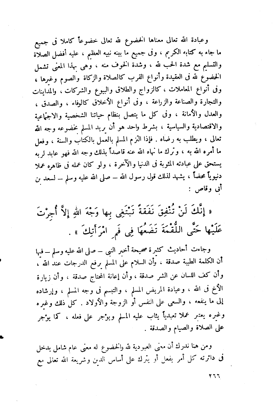وعبادة الله تعالى معناها الخضوع لله تعالى خضوعاً كاملاً في جميع ما جاء به كتابه الكريم، وفي جميع ما بينه نبيه العظيم، عليه أفضل الصلاة والتسليم مع شدة الحب لله، وشدة الخوف منه، وهي بهذا المعنى تشمل الخضوع لله في العقيدة وأنواع القرب كالصلاة والزكاة والصوم وغيرها، وفي أنواع المعاملات كالزواج والطلاق والبيوع والشركات، والمداينات والتجارة والصناعة والزراعة، وفي أنواع الأخلاق كالوفاء، والصدق، والعدل والأمانة، وفي كل ما يتصل بنظام حياتنا الشخصية والاجتماعية والاقتصادية والسياسية، بشرط واحد هو أن يريد المسلم بخضوعه وجه الله تعالى، ويطلب به رضاه. فإذا التزم المسلم بالعمل بالكتاب والسنة، وفعل ما أمره الله به، وترك ما نهاه الله عنه قاصداً بذلك وجه الله فهو عابد لربه يستحق على عبادته المثوبة في الدنيا والآخرة، ولو كان عمله في ظاهره عملاً دنيوياً محضاً، يشهد لذلك قول رسول الله صلى الله عليه وسلم لسعد بن أبي وقاص: