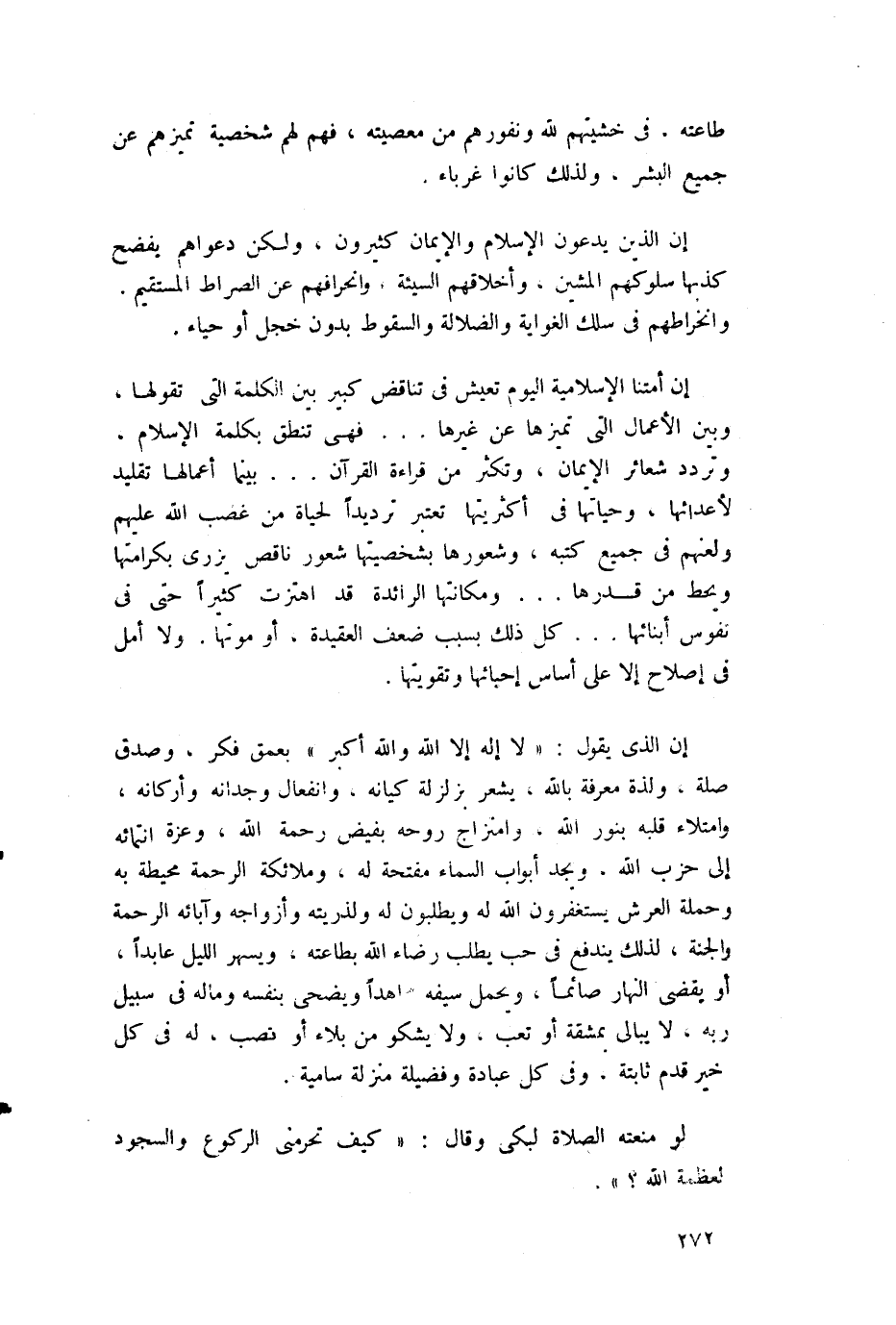 إن أمتنا الإسلامية اليوم تعيش في تناقض كبير بين الكلمة التي تقولها، وبين الأعمال التي تميزها عن غيرها ... فهي تنطق بكلمة الإسلام، وتردد شعائر الإيمان، وتكثر من قراءة القرآن .. بينما أعمالها تقليد لأعدائها، وحياتها في أكثريتها تعتبر ترديداً لحياة من غضب الله عليهم ولعنهم في جميع كتبه، وشعورها بشخصيتها شعور ناقص يزري بكرامتها ويحط من قدرها ... ومكانتها الرائدة قد اهتزت كثيراً حتى في نفوس أبنائها ... كل ذلك بسبب ضعف العقيدة، أو موتها. ولا أمل في إصلاح إلا على أساس إحيائها وتقويتها.