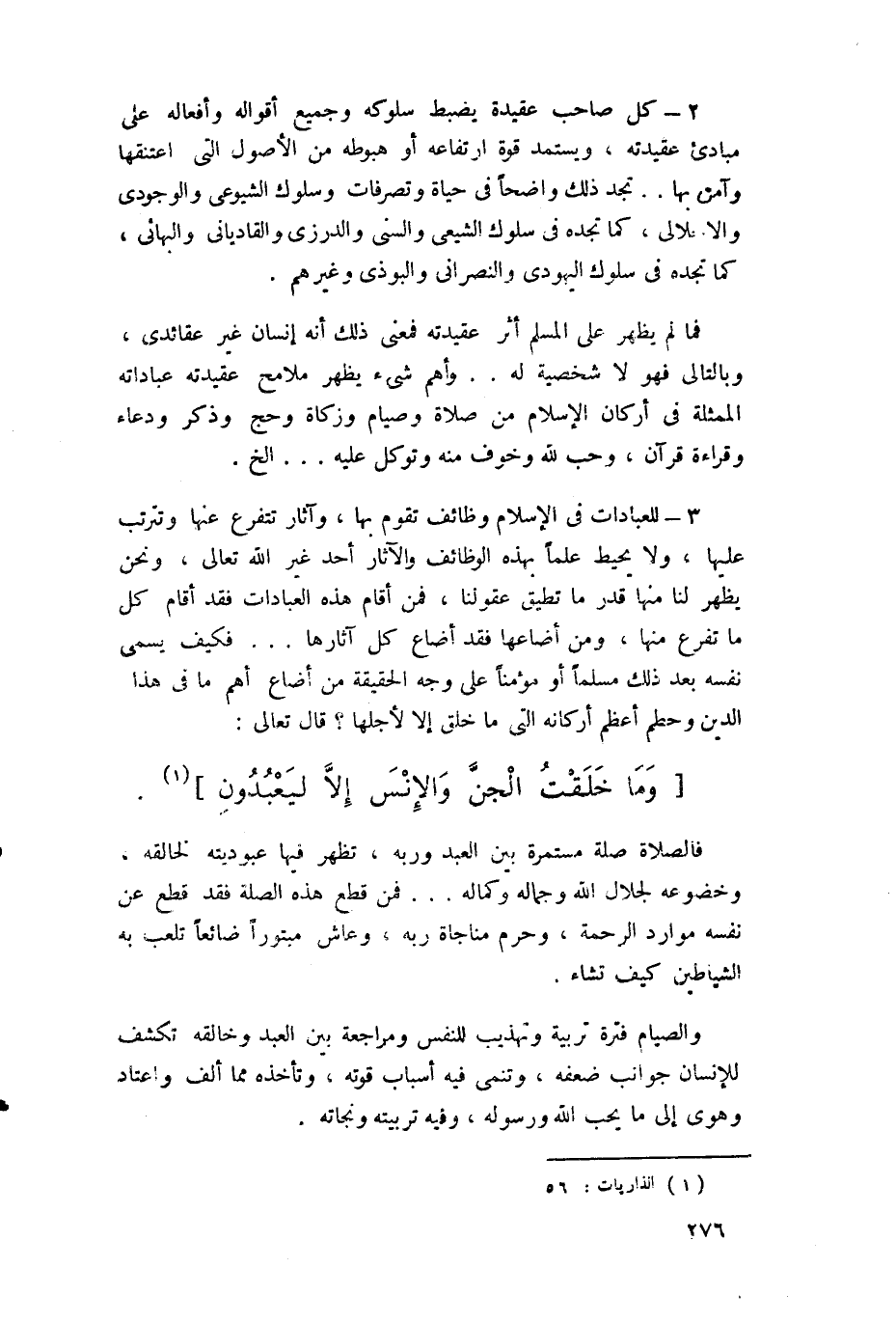 2 - كل صاحب عقيدة يضبط سلوكه وجميع أقواله وأفعاله على مبادئ عقيدته، ويستمد قوة ارتفاعه أو هبوطه من الأصول التي اعتنقها وآمن بها. تجد ذلك واضحاً في حياة وتصرفات وسلوك الشيوعي والوجودي والانحلالي، كما تجده في سلوك الشيعي والسني والدرزي والقادياني والبهائي، كما تجده في سلوك اليهودي والنصراني والبوذي وغيرهم.