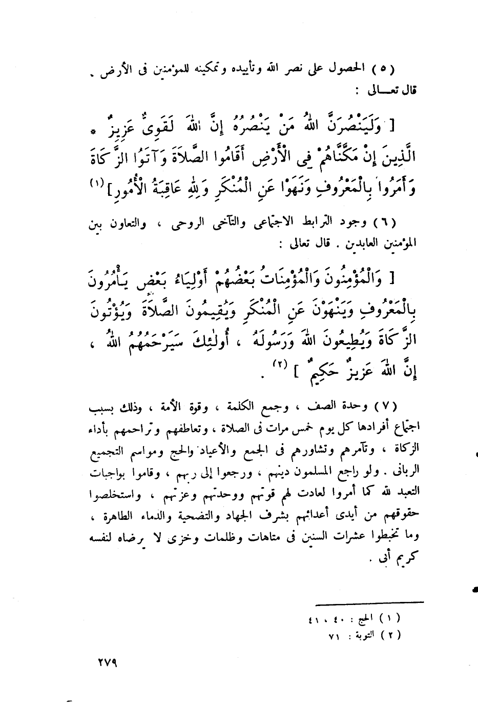 {ولينصرن الله من ينصره إن الله لقويٌ عزيز. الذين إن مكناهم في الأرض أقاموا الصلاة وآتوا الزكاة وأمروا بالمعروف ونهوا عن المنكر ولله عاقبة الأمور} [الحج: 40 - 41].