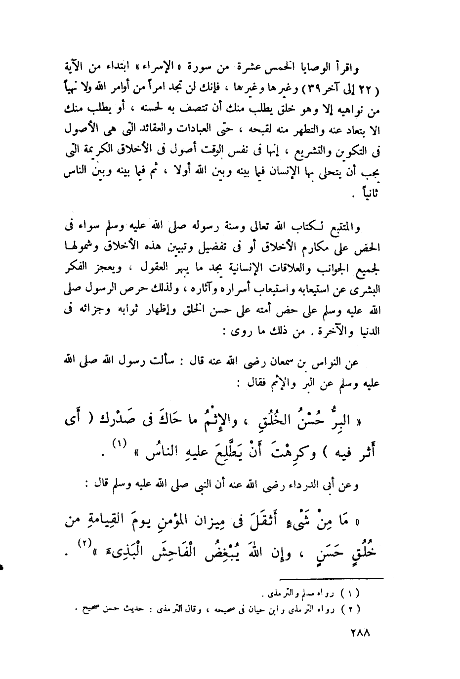 والمتتبع لكتاب الله تعالى وسنة رسوله صلى الله عليه وسلم سواء في الحض على مكارم الأخلاق أو في تفضيل وتبيين هذه الأخلاق وشمولها لجميع الجوانب والعلاقات الإنسانية يجد ما يبهر العقول، ويعجز الفكر البشري عن استيعابه واستيعاب أسراره وآثاره، ولذلك حرص الرسول صلى الله عليه وسلم على حض أمته على حسن الخلق وإظهار ثوابه وجزائه في الدنيا والآخرة. من ذلك ما روي: