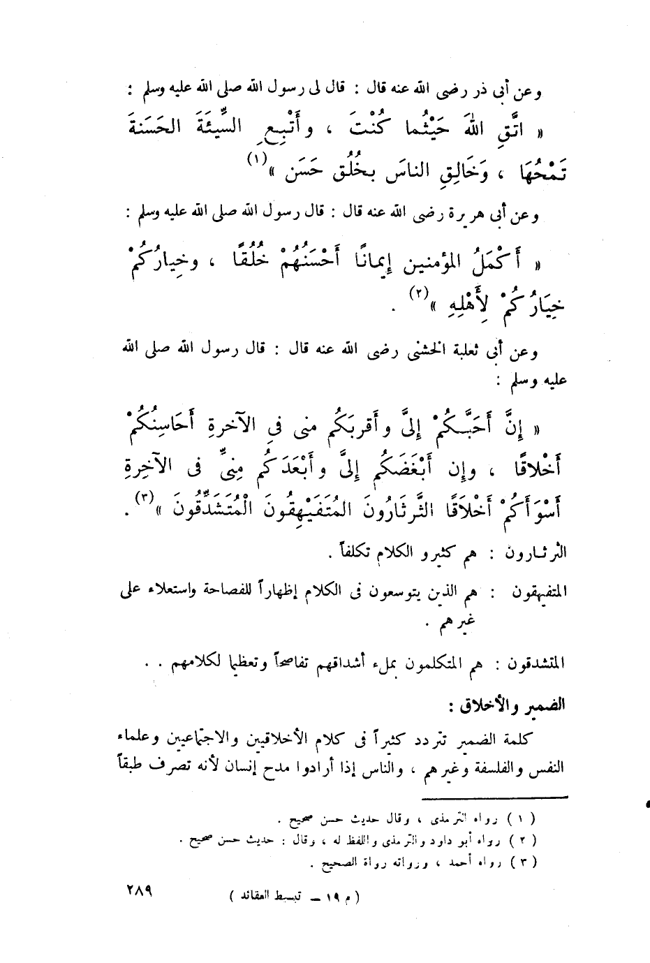 "إن أحبكم إليّ وأقربكم مني في الآخرة أحاسنكم أخلاقاً، وإن أبغضكم إليّ وأبعدكم منّي في الآخرة أسوأكم أخلاقاً الثرثارون المتفيهقون المتشدقون" (¬3).
