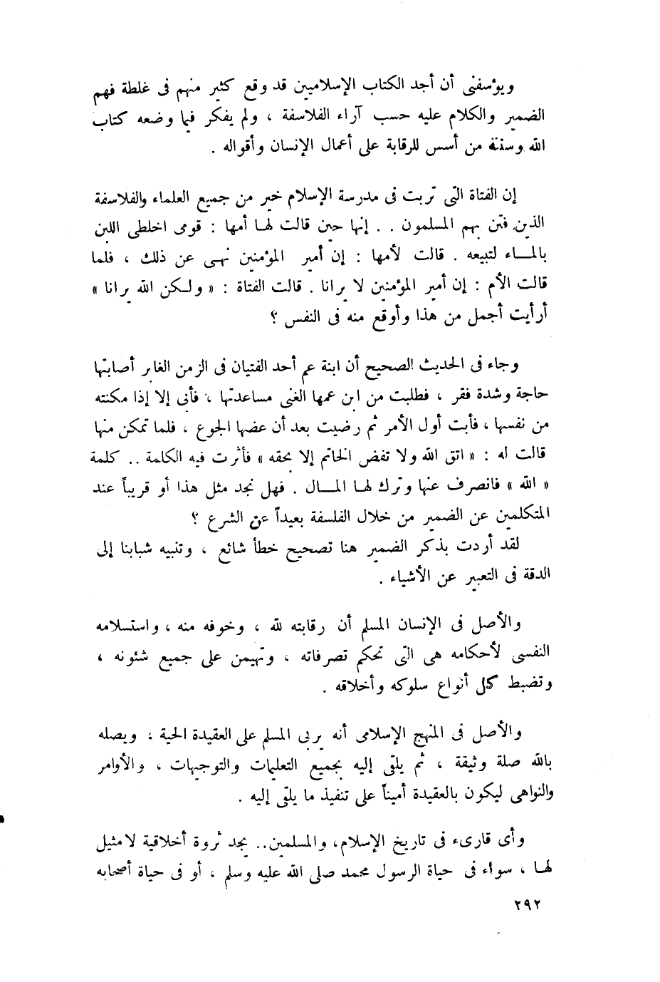 ويؤسفني أن أجد الكتاب الإسلاميين قد وقع كثير منهم في غلطة فهم الضمير والكلام عليه حسب آراء الفلاسفة، ولم يفكر فيما وضعه كتاب الله وسنته من أسس للرقابة على أعمال الإنسان وأقواله.