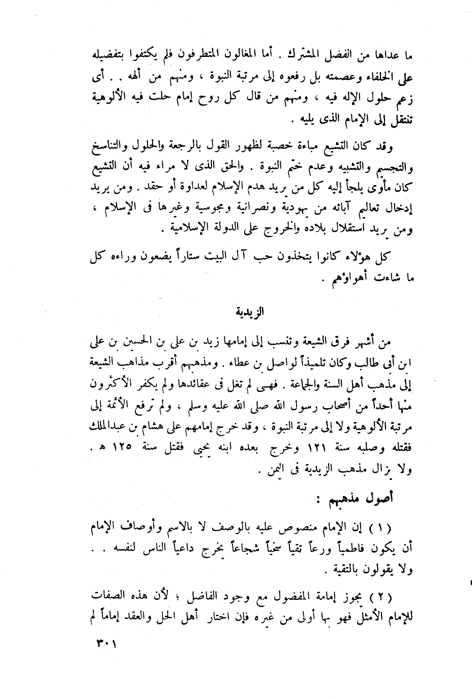 من أشهر فرق الشيعة وتنسب إلى إمامها زيد بن علي بن الحسين بن علي ابن أبي طالب وكان تلميذاً إلى مذهب أهل السنة والجماعة. فهي لم تغل في عقائدها ولم يكفر الأكثرون منها أحداً من أصحاب رسول الله صلى الله عليه وسلم، ولم ترفع الائمة إلى مرتبة الألوهية ولا إلى مرتبة النبوة، وقد خرج إمامهم على هشام بن عبد الملك فقتله وصلبه سنة 121 هوخرج بعده ابنه يحيى فقتل سنة 125 هولا يزال مذهب الزيدية في اليمن.