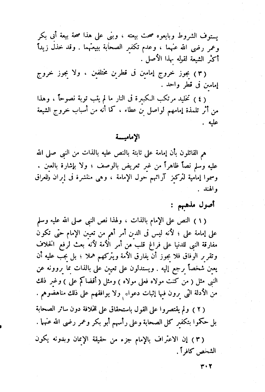 1 - النص على الإمام بالذات، ولهذا نص النبي صلى الله عليه وسلم على إمامة علي، لأنه ليس في الدين أمر أهم من تعيين الإمام حتى تكون مفارقة النبي للدنيا على فراغ قلب من أمر الأمة لأنه بعث لرفع الخلاف وتقرير الوفاق فلا يجوز أن يفارق الأمة ويتركهم هملاً، بل يجب عليه أن يعين شخصاً يرجع إليه. ويستدلون على تعيين علي بالذات بما يروونه عن النبي مثل (من كنت مولاه فعلي مولاه) ومثل (أقضاكم علي) وغير ذلك من الأدلة التي يرون فيها إثبات دعواهم ولا يوافقهم على ذلك مناهضوهم.