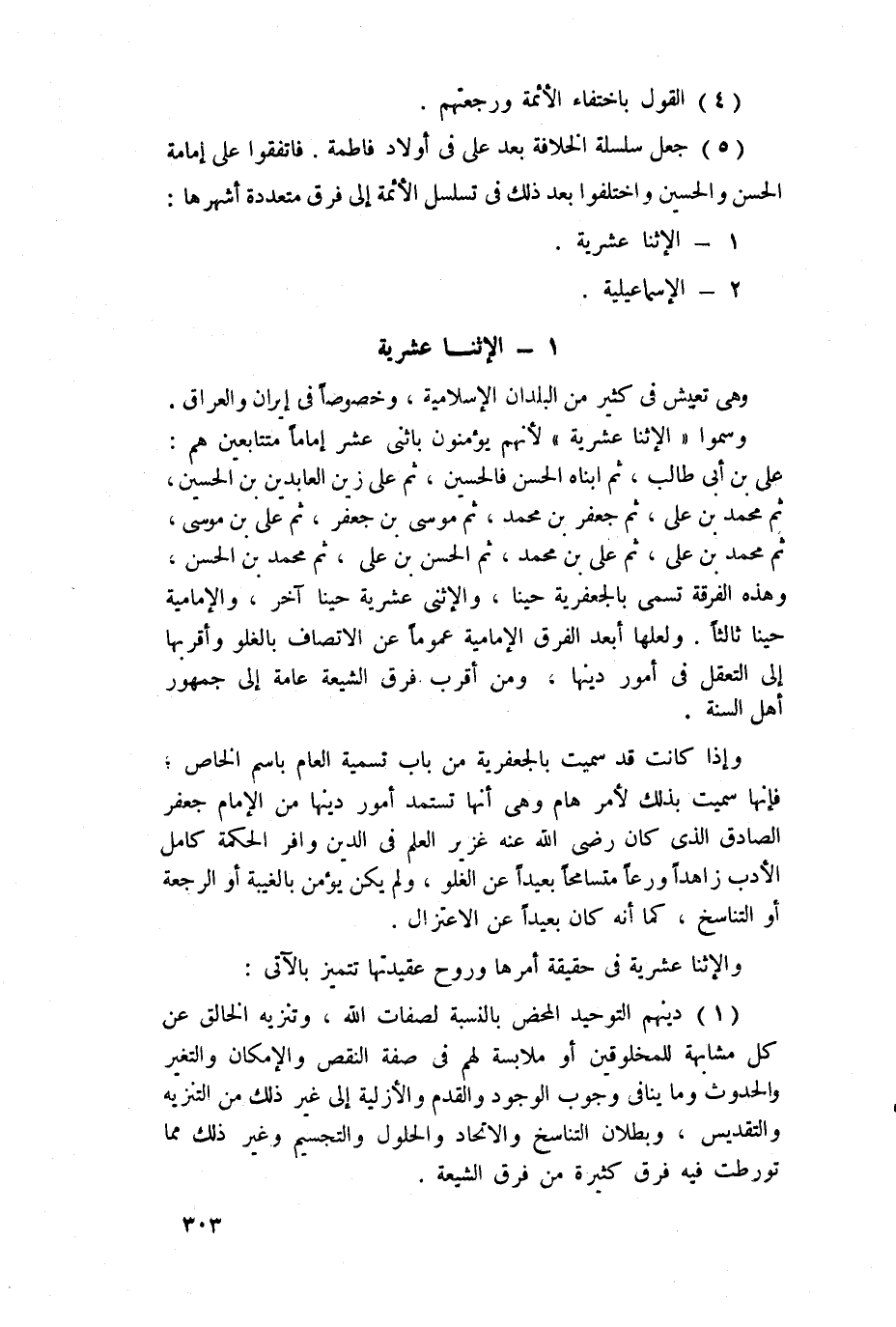 وهي تعيش في كثير من البلدان الإسلامية، وخصوصاً في إيران والعراق. وسموا "الإثنا عشرية" لأنهم يؤمنون باثني عشر إماماً متتابعين هم: علي بن أبي طالب، ثم ابناه الحسن فالحسين، ثم علي زين العابدين بن الحسين، ثم محمد بن علي، ثم جعفر بن محمد، ثم موسى بن جعفر، ثم علي بن موسى، ثم محمد بن علي، ثم علي بن محمد، ثم الحسن بن علي، ثم محمد بن الحسن، وهذه الفرقة تسمى بالجعفرية حيناً، والإثني عشرية حيناً آخر، والإمامية حيناً ثالثاً. ولعلها أبعد الفرق الإمامية عموماً عن الاتصاف بالغلو وأقربها إلى التعقل في أمور دينها، ومن أقرب فرق الشيعة عامة إلى جمهور أهل السنة.