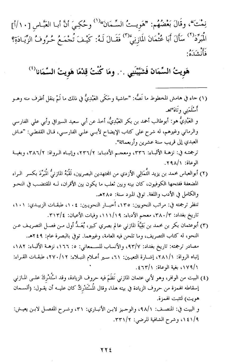 نمت"، وقال بعضهم: "هَويتُ السِّمانَ" وحُكِيَ أنّ أبا العبّاس المُبَرِّد سأل أبا عثمان المازنيَّ فقال له: كيف تجمع حروف الزيادة؟ فأنشده: