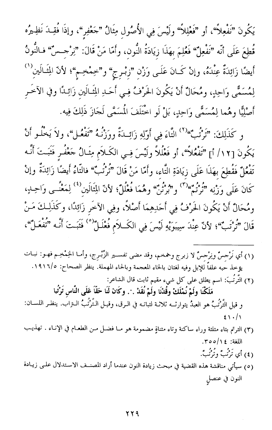 وكذلك: "تَرْتُب" التّاء في أوّله زائدةٌ ووزنه "تَفْعُل"، ولا يخلو أن يكون "تَفْعُلاً"، أو فَعْلُلاً وليس في الكلام مثال جَعْفَرٍ فثبت أنّه تَفْعُلٌ فقطع بهذا على زيادة التّاء، وأمّا من قال "تُرْتُبٌ" فالتّاء أيضًا زائدةٌ وإن كان على وزنه "تُرْتُمٌ" و"بُرْثُنٌ" وهما فُعْلُلٌ، لأنّ المثالين لمعنًى واحد، ومحالٌ أن يكون الحرف في أحدهما أصلاً، وفي الآخر زائدًا، وكذلك من قال "تُرْتَبٌ"، لأنّ عند سيبويه ليس في الكلام فُعْلَلٌ فثبت أنّه "تُفْعَلٌ"،