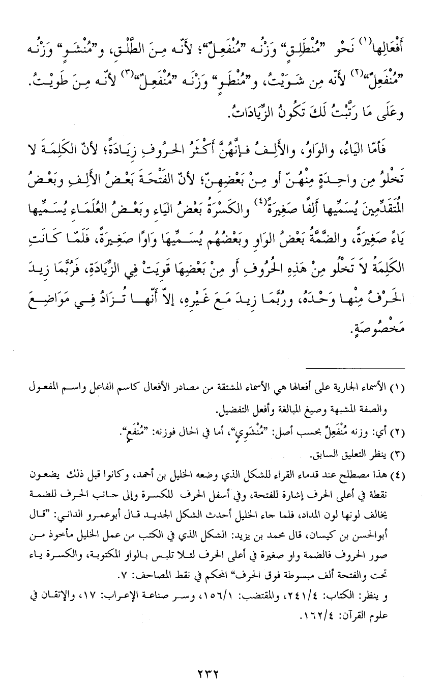أفعالها نحو "مُنْطَلِقٍ" وزنه "مُنْفَعِلٌ"، لأنّه من الطَّلْقِ، و"مُنْشَوٍ" وزنه "مُنْفَعِلٌ" لأنّه من شويْتُ، و"مُنْطَوٍ" وزنه "مُنْفَعِلٌ" لأنّه من طَوَيْتُ. وعلى ما رتَّبْتُ لك تكون الزّيادات.