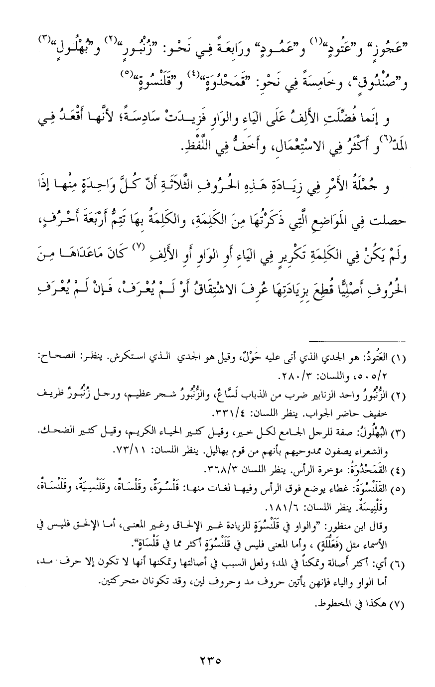 "عَجُوزٍ" و"عَتودٍ" و"عَمودٍ" ورابعة في نحو: "زُنْبورٍ" و"بُهْلولٍ" و"صُنْدوقٍ"، وخامسة في نحو: "قَمَحْدُوَةٍ" و"قَلَنْسُوَةٍ".