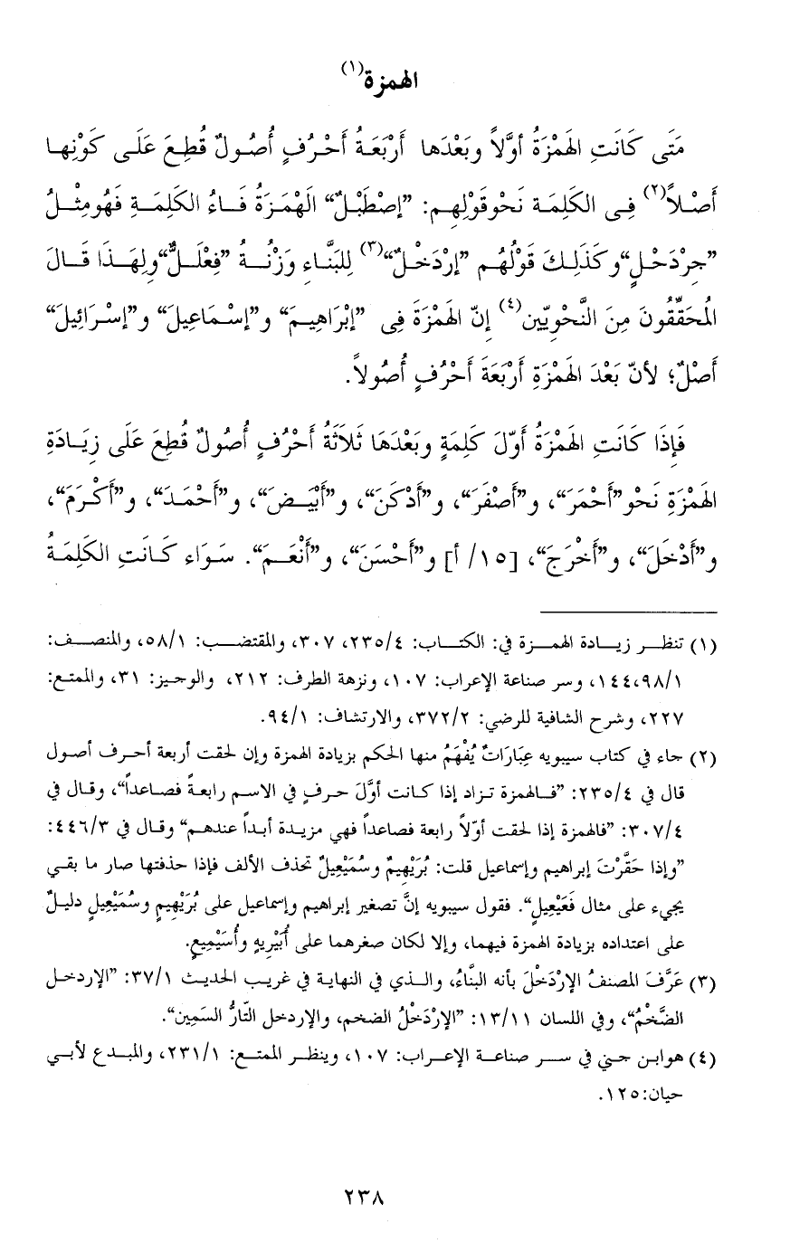 متى كانت الهمزة أوّلاً وبعدها أربعة أحرف أصول قطع على كونها أصلاً في الكلمة نحو قولهم: "إصْطَبْلٌ" الهمزة فاء الكلمة فهو مثل "جِرْدَحْلٍ" وكذلك قولهم "إرْدَخْلٌ" للبَنّاءِ وزنهُ "فِعْلَلٌّ" ولهذا قال المحقِّقون من النحويين إن الهمزة في "إبراهيم" و"إسماعيل" و"إسرائيل" أصلٌ، لأنّ بعد الهمزة أربعة أحرف أصولاً.
