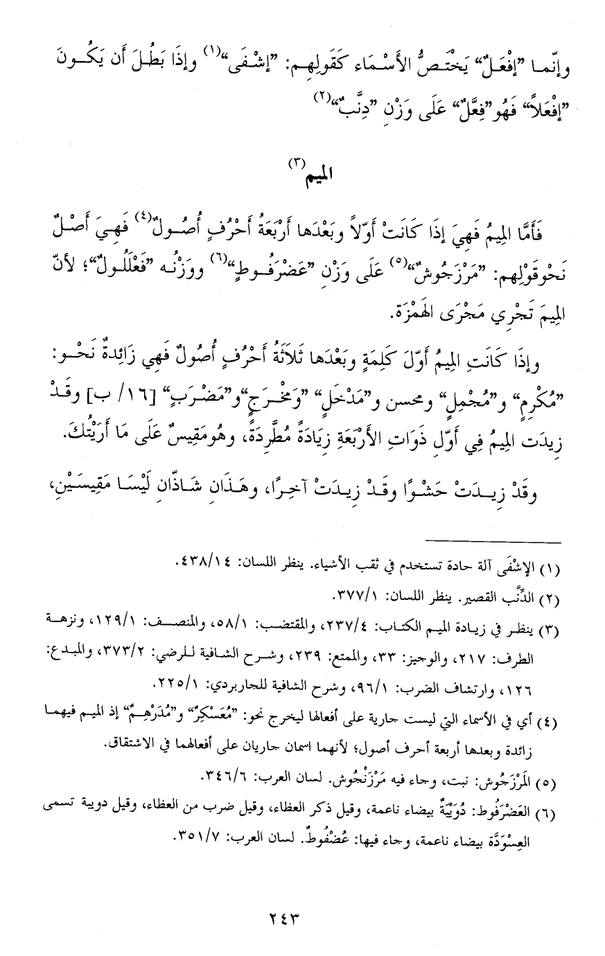 فأمّا الميم فهي إذا كانت أوَّلاً وبعدها أربعة أحرف أصول فهي أصل نحو قولهم: "مَرْزَحوشٌ" على وزن "عَضْرَفوطٍ" ووزنه "فَعْلَلُولٌ"، لأنّ الميم تجري مجرى الهمزة.