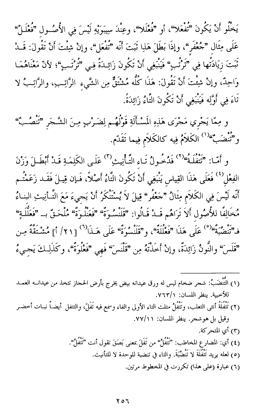 وأمّا: "تَتْفُلَةٌ" فدخول تاء التأنيث على الكلمة قد أبطل وزن الفعل فعلى هذا القياس ينبغي أن تكون التّاء أصلاً، فإن قيل فقد زعمتم أنّه ليس في الكلام مثال "جعْفُر" قيل لا يُسْتَنْكَرُ أن يجيء مع التأنيث البناءُ مخالفًا للأصول ألا تراهم قد قالوا: "قَلَنْسُوَةٌ" "فَعَنْلُوَةٌ" مُلْحَقٌ بـ" فَعَلُّلَةٍ" فـ"تَنْضُبَةٌ" على هذا "فَعْلُلَةٌ"، و"قَلَنْسُوَةٌ" على هذا مشتقّة من "قَلَسَ" والنّون زائدة، وإن أخذته من "قَلْنَسَ" فهي "فَعْلُوَةٌ"، وكذلك يجيء