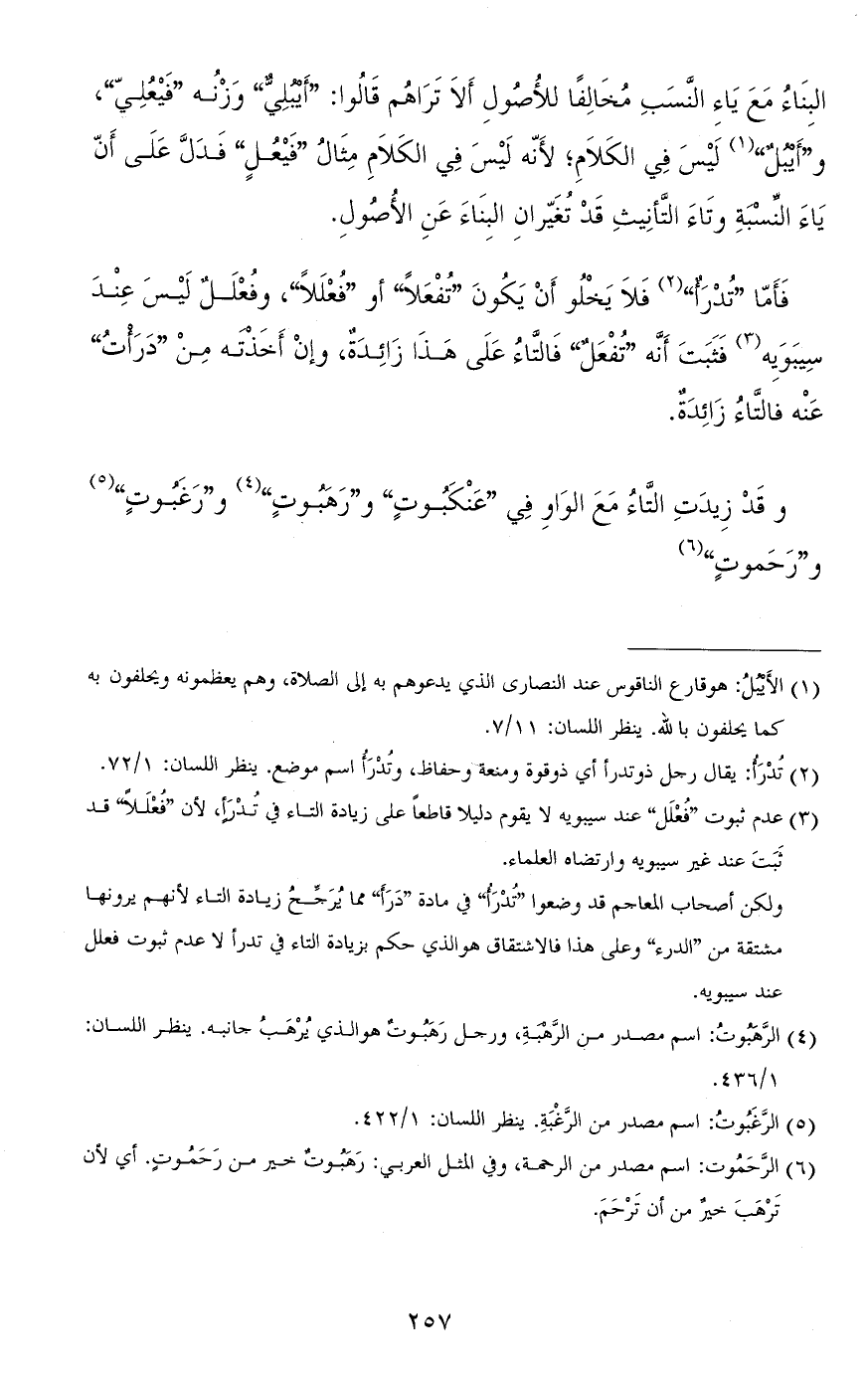فأمّا "تُدْرَأ" فلا يخلو أن تكون "تُفْعَلاً" أو "فُعْلَلاً"، وفُعْلَلٌ ليس عند سيبويه فثبت أنّه "تُفْعَلٌ" فالتّاء على هذا زائدة، وإن أخذته من "دَرَاتُ" عنه فالتّاء زائدة.