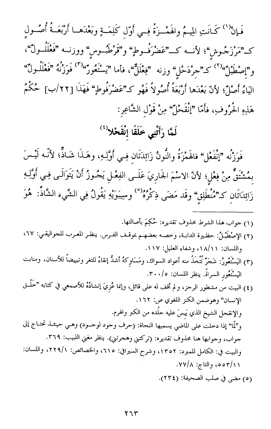 فإن كانت الميم والهمزة في أوّل كلمة وبعدها أربعة أصول كـ"مَرْزَجوشٍ"، لأنه كـ"عَضْرَفوطٍ" و"قَرْطَبوسٍ" ووزنه "فَعْلَلُولٌ"، و"إصْطَبْلٌ" كـ"جِرْدَحْلٍ" وزنه "فِعْلَلٌّ"، فأما "يَسْتَعورٌ" فوزنه "فَعْلَلُولٌ" الياءُ أصل؛ لأنّ بعدها أربعة أصولاً فهو كـ"عَضْرَفوطٍ" فهذا حكم هذه الحروف، فأمّا "إنْقَحْلٌ" من قول الشاعر: