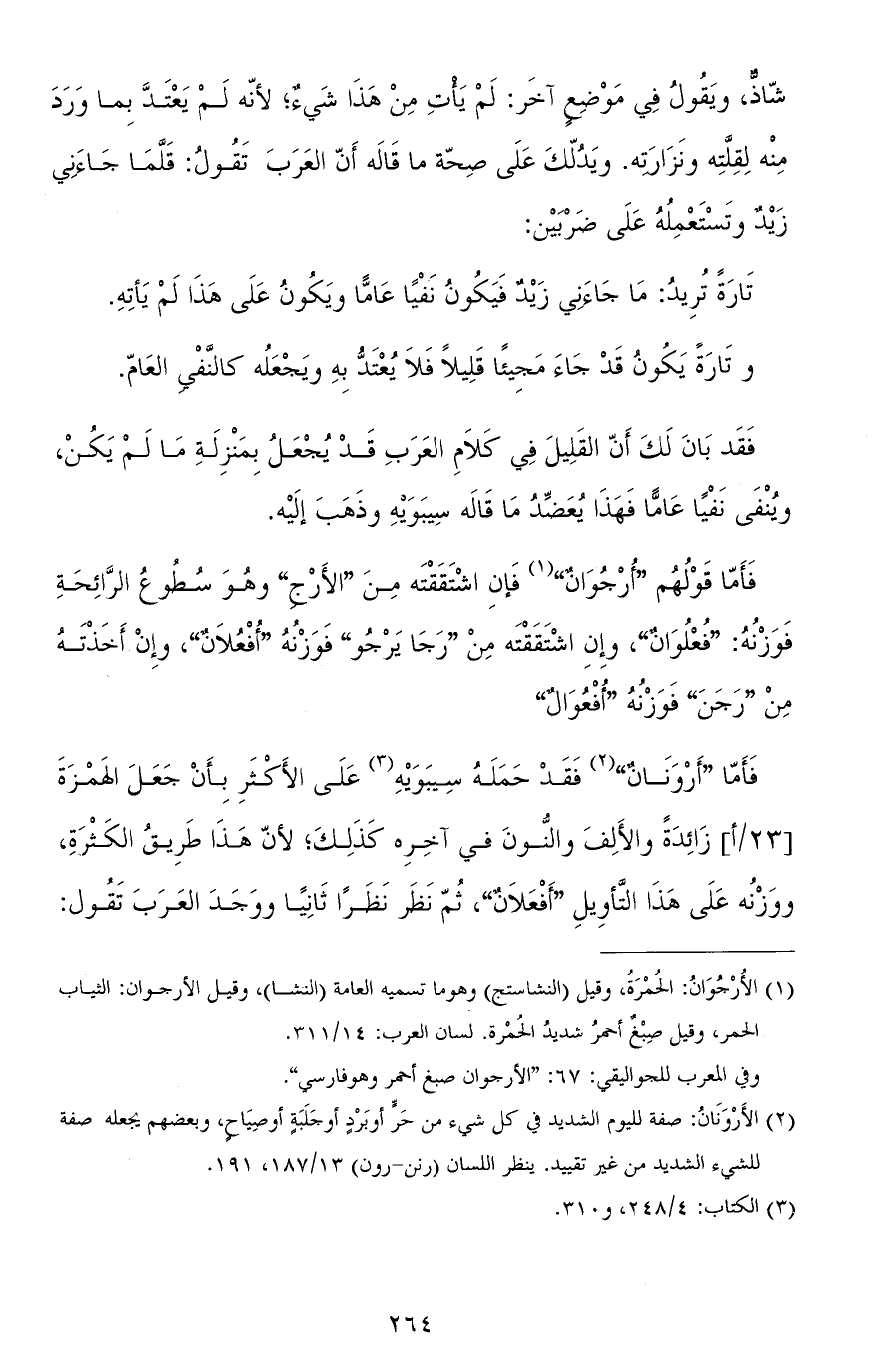 فأمّا قولهم "أُرْجُوانٌ" فإن اشتققته من "الأَرْج" وهو سطوع الرّائحة فوزنه: "فُعْلُوانٌ"، وإن اشتققته من "رجا يرجو" فوزنه "أُفْعُلانٌ"، وإن أخذته من "رَجَنَ" فوزنه "أُفْعُوالٌ".