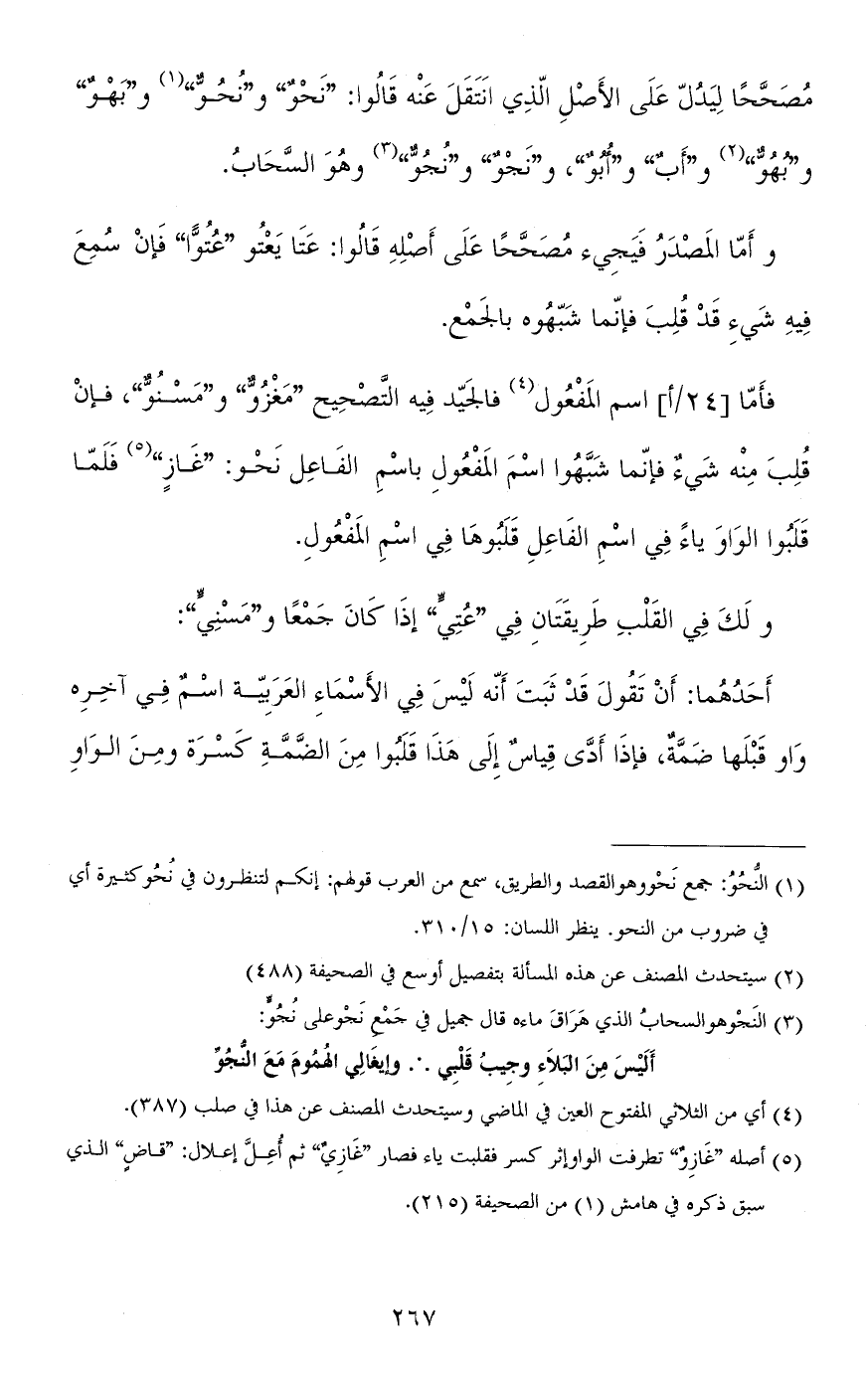 مُصَحَّحًا ليدلّ على الأصل الذي انتقل عنه قالوا: "نَحْوٌ" و"نُحُوٌّ" و"بَهْوٌ" و"بُهُوٌّ" و"أبٌ" و"أُبُوٌّ"، و"نَجْوٌ" و"نُجُوٌّ" وهو السّحاب.