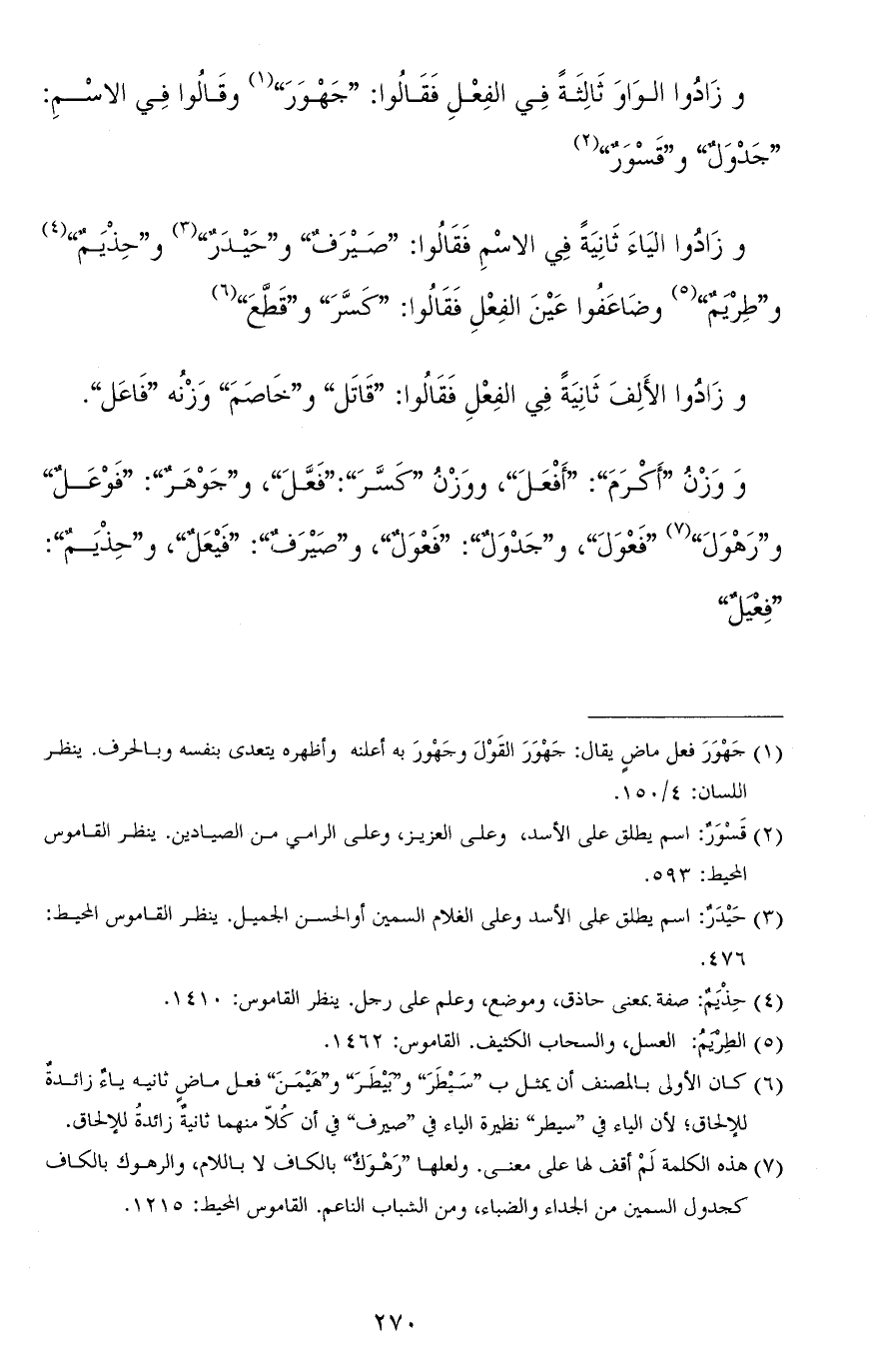 وزادوا الواو ثالثة في الفعل فقالوا: "جَهْوَرَ" وقالوا في الاسم: "جَدْوَلٌ" و"قَسْوَرٌ".