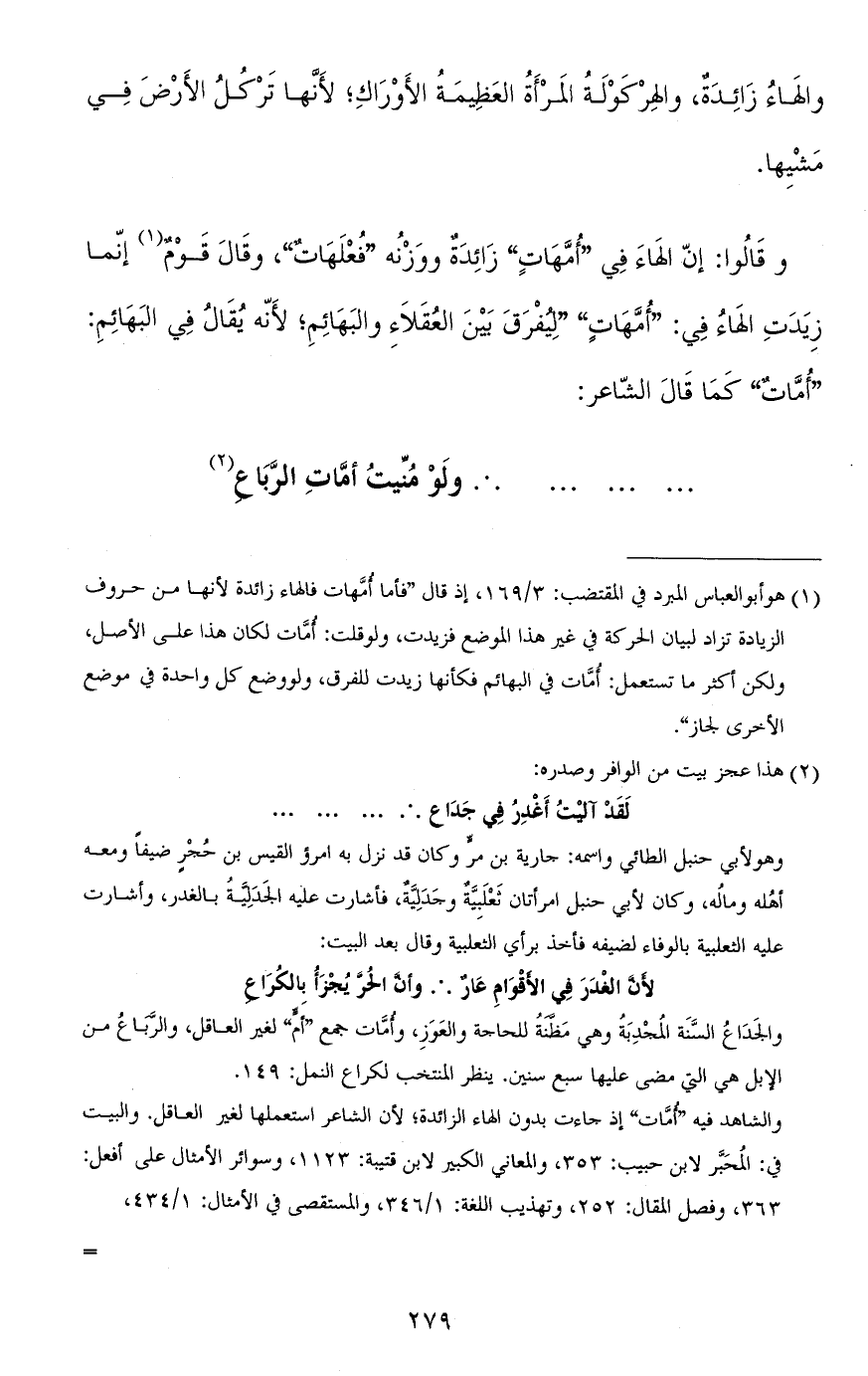 وقالوا: إنّ الهاء في "أمَّهاتٍ" زائدة ووزنه "فُعْلَهاتٌ"، وقال قومٌ إنّما زيدت الهاء في: "أمّهاتٍ" ليُفْرَقَ بين العقلاء والبهائم؛ لأنّه يقال في البهائم: "أمّاتٌ" كما قال الشاعر: