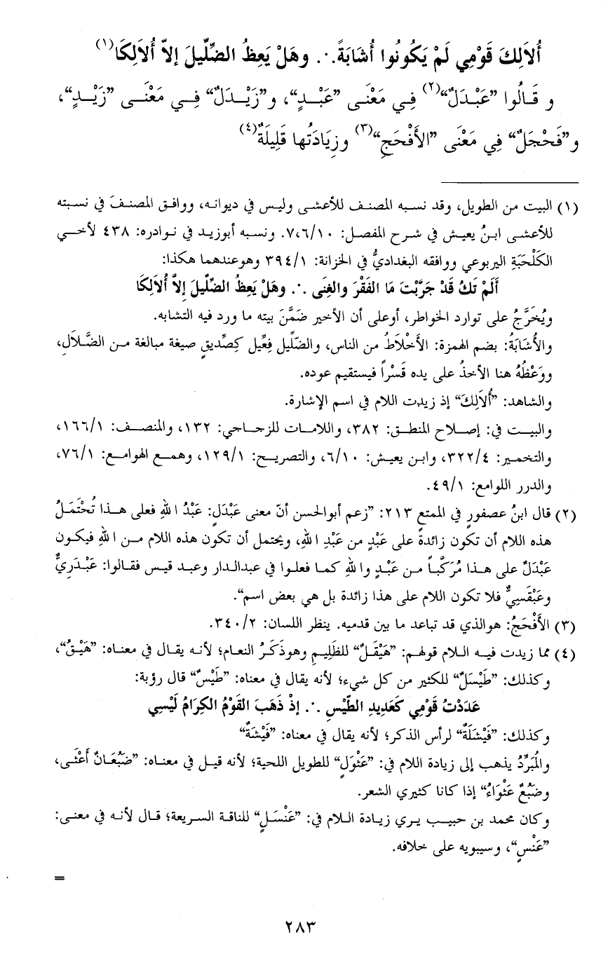 وقالوا "عَبْدَلٌ" في معنى "عبدٍ"، و"زَيْدَلٌ" في معنى "زَيْدٍ"، و"فَحْجَلٌ" في معنى "الأفْحَجِ" وزيادتها قليلة
