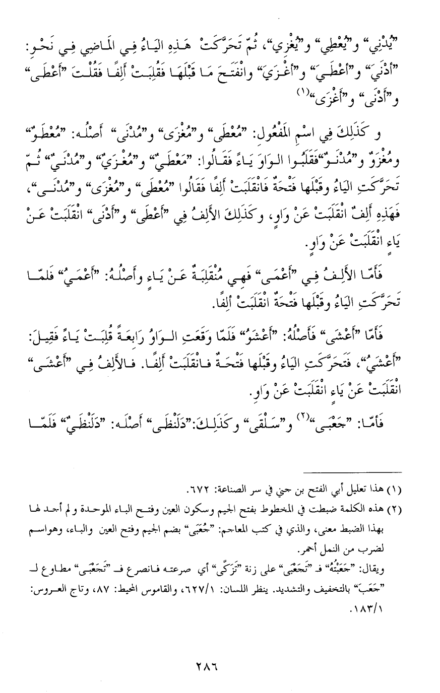 وكذلك في اسم المفعول: "مُعْطَى" و"مُغْزَى" و"مُدْنَى" أصله: "مُعْطَوٌ" و"مُغْزَوٌ" و"مُدْنَوٌ" فقلبوا الواو ياء فقالوا: "مَعْطَيٌ" و"مُغْزَيٌ" و"مُدْنَيٌ" ثمّ تحرّكت الياء وقبلها فتحة فانقلبت ألفًا فقالوا "مُعْطَى" و"مُغْزَى" و"مُدْنَى"، فهذه ألف انقلبت عن واو، وكذلك الألف في "أعطى" و"أدنى" انقلبت عن ياء انقلبت عن واو.