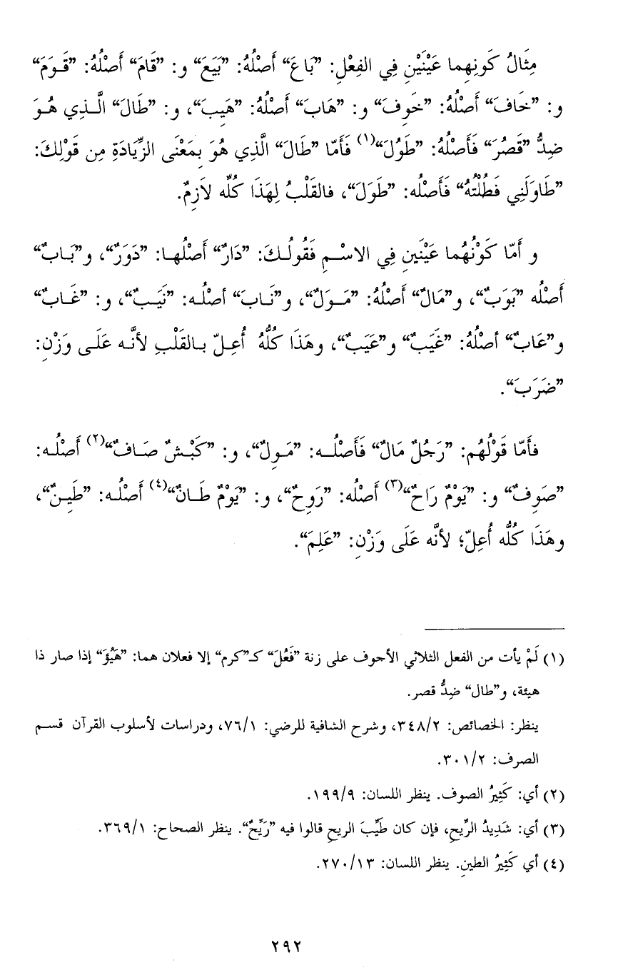 فأمّا قولهم: "رجُلٌ مالٌ" فأصله "مَوِلٌ"، و"كَبْشٌ صافٌ" أصله: "صَوِفٌ" و"يومٌ راحٌ" أصله "رَوِحٌ" و"يومٌ طانٌ" أصله "طَيِنٌ" وهذا كلّه أُعِلّ، لأنّه على وزن "عَلِمَ".