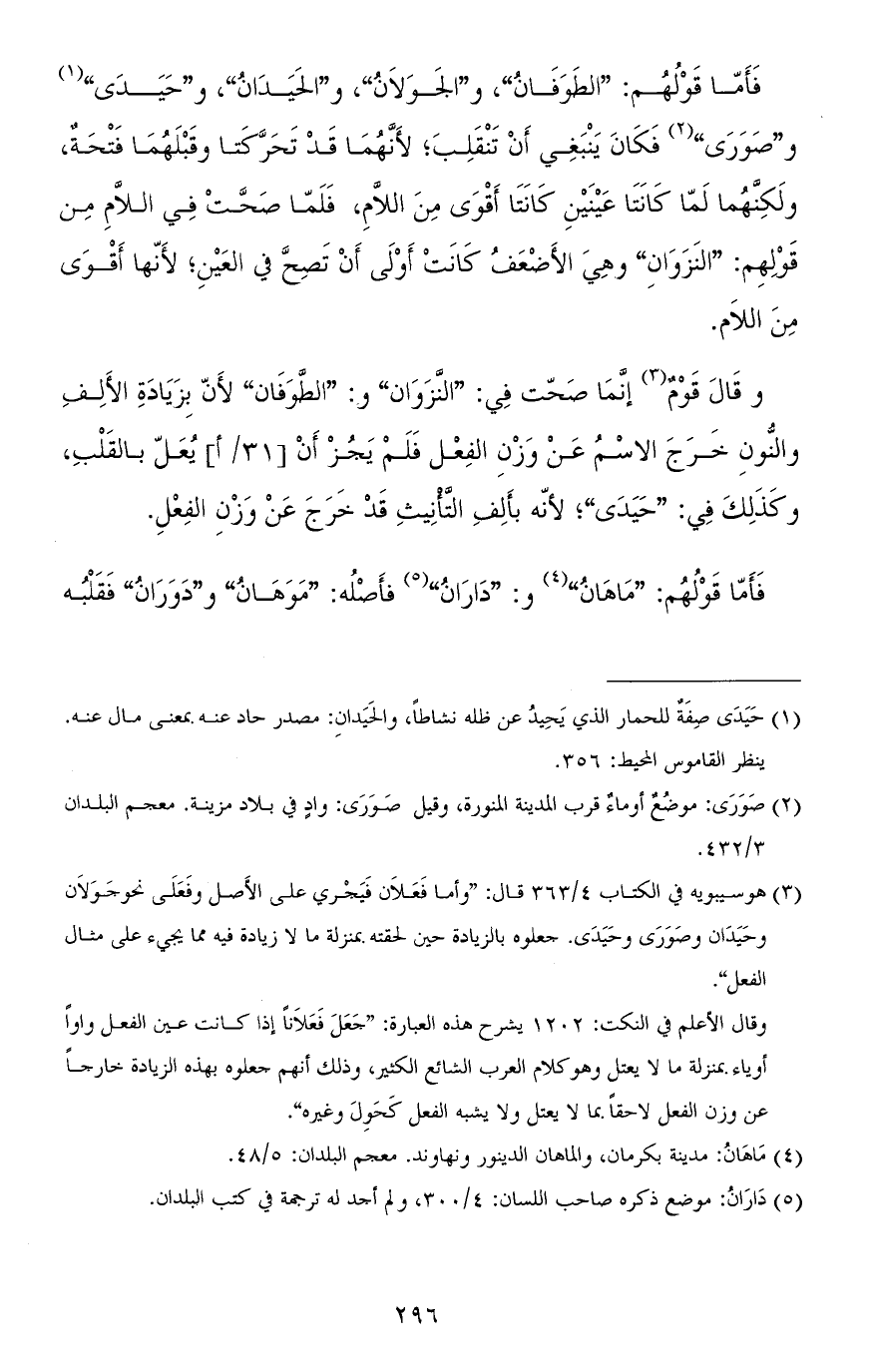 فأمّا قولهم: "ماهانُ" و"دارانُ" فأصله: "مَوَهانُ" و"دَوَرانُ" فقلبه