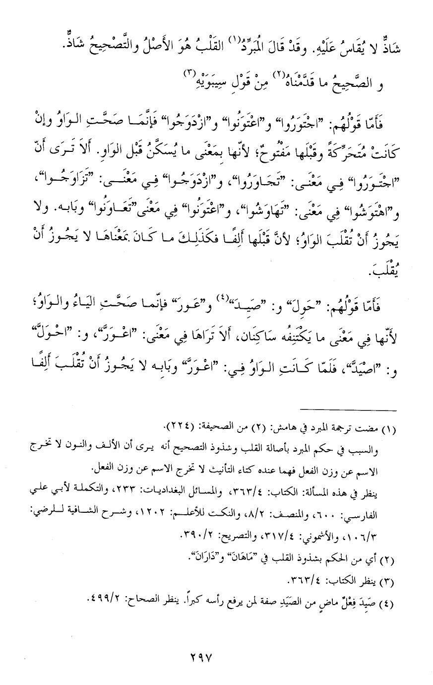 فأمّا قولهم: "اجْتوروا" و"اعْتَوَنوا" و"ازْدَوَجُوا" فإنّما صحّت الواو وإن كانت متحرّكة وقبلها مفتوح، لأنّها بمعنى ما يُسَكَّن قبل الواو. ألا ترى أنّ "اجْتَوَروا" في معنى "تجاوروا"، و"ازْدَوَجوا" في معنى "تزاوَجوا"، و"اهْتَوَشوا" في معنى "تهاوَشوا"، و"اعْتَوَنوا" في معنى "تعاوَنوا" وبابه. ولا يجوز أن تقلب الواو، لأنّ قبلها ألفًا فكذلك ما كان بمعناها لا يجوز أن يقلب.