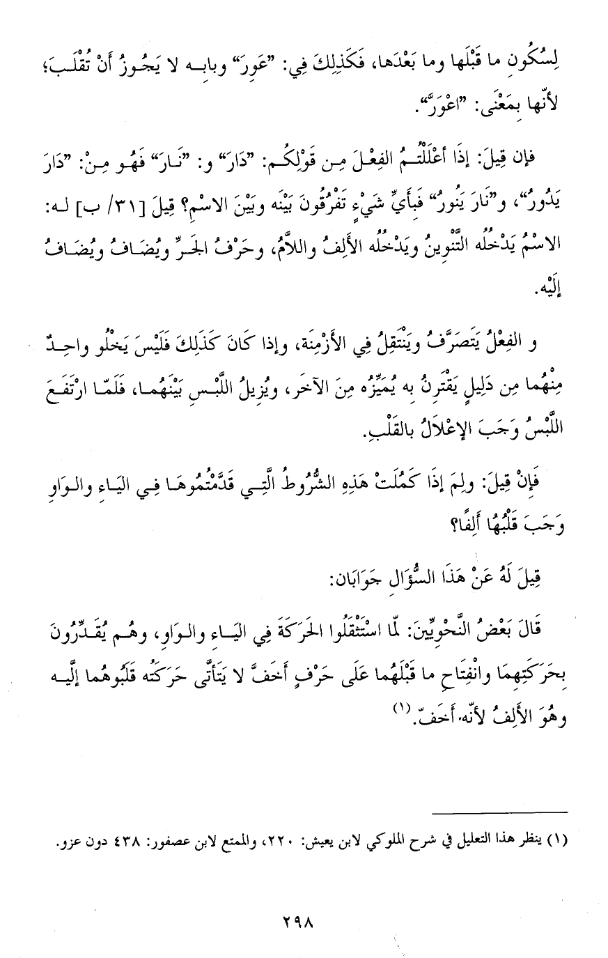 فإن قيل: إذا أعللتم الفعل من قولكم: "دارَ" و"نارَ" فهو من "دارَ يدورُ"، و"نارَ يَنُورُ" فبأيّ شيء تفرقون بينه وبين الاسم؟ قيل له: الاسم يدخله التّنوين ويدخله الألف واللام، وحرف الجر ويضاف ويضاف إليه.