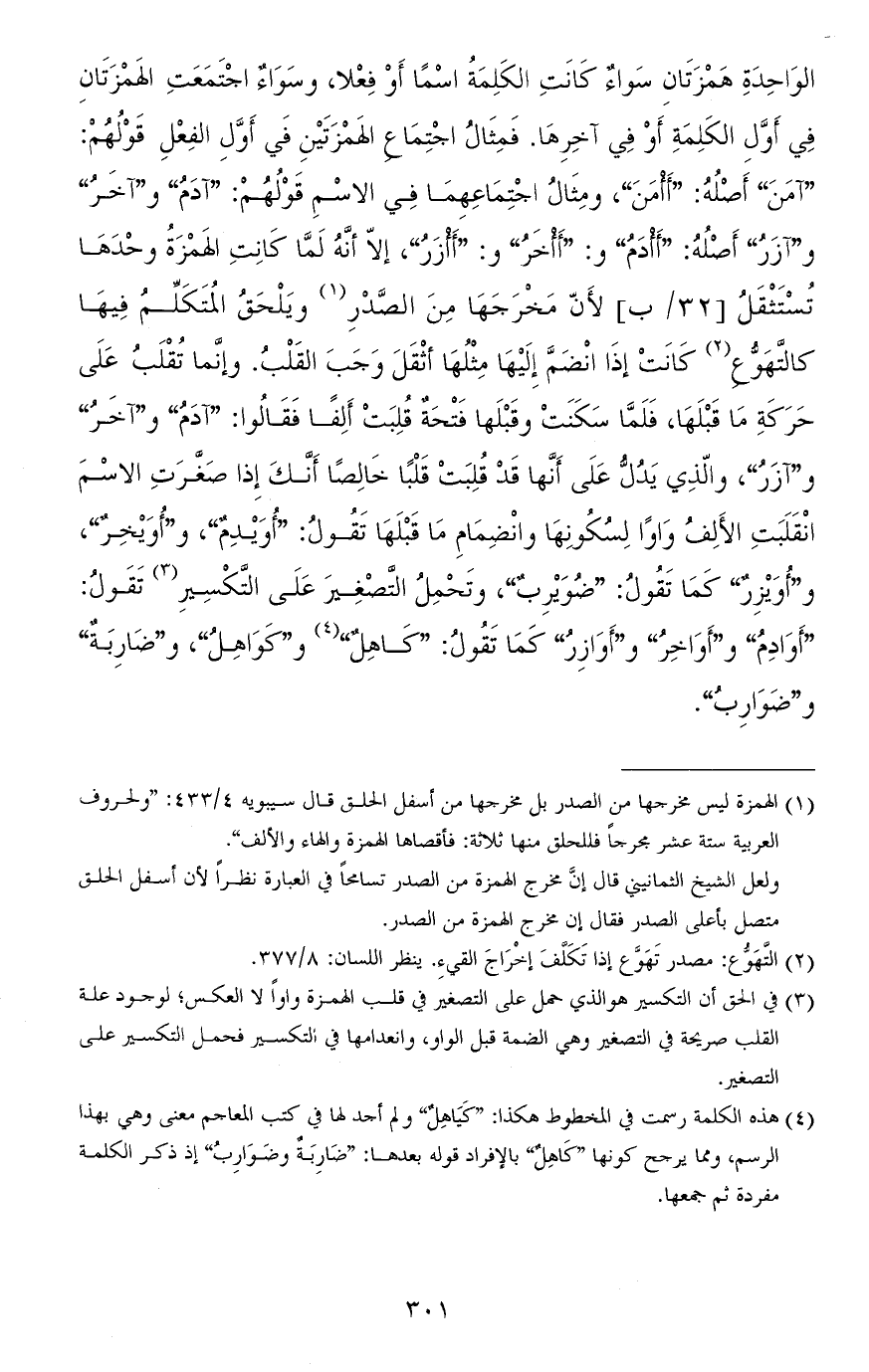 الواحدة همزتان سواء كانت الكلمة اسمًا أو فعلا، وسواء اجتمعت الهمزتان في أوّل الكلمة أو في آخرها. فمثال اجتماع الهمزتين في أوّل الفعل قولهم: "آمَنَ" أصله "أامَنَ"، ومثال اجتماعهما في الاسم قولهم: "آدمُ" و"آخَرُ" و"آزَرُ" أصله: "أادَمُ" و"أَاخَرُ" و"أَازَرُ"، إلاّ أنّه لمّا كانت الهمزة وحدها تُسْتَثْقَل لأنّ مخرجها من الصّدر ويلحق المتكلّم فيها كالتّهوّع كانت إذا انضمّ إليها مثلها أثقل وجب القلب. وإنّما تقلب على حركة ما قبلها، فلمّا سكنت وقبلها فتحة قلبت ألفًا فقالوا: "آدَمُ" و"آخَرُ" و"آزَرُ"، والّذي يدلّ على أنّها قد قلبت قلبًا خالصًا أنّك إذا صغّرت الاسم انقلبت الألف واوًا لسكونها وانضمام ما قبلها تقول: "أُوَيْدِمٌ" و"أُوَيْخِرٌ" و"أُوَيْزِرٌ" كما تقول "ضُوَيْرِبٌ"، وتحمل التصغير على التّكسير تقول: "أوادِمُ" و"أوَاخِرُ" و"أوَازِرُ" كما تقول: "كاهِلٌ" و"كَواهِلُ"، و"ضارِبَةٌ" و"ضَوارِبُ".