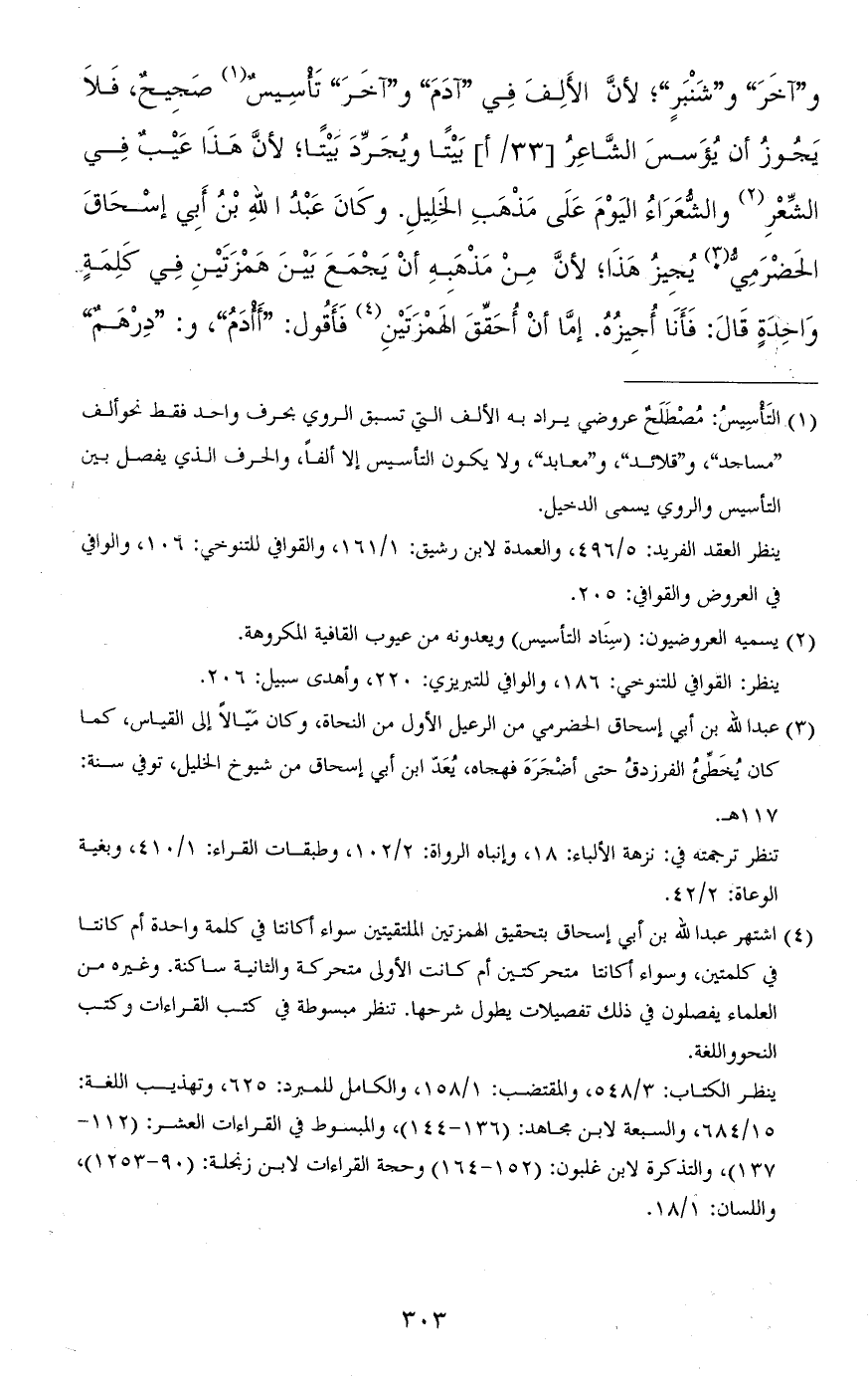 و"آخَرَ" و"شَنْبَرٍ"، لأنّ الألف في "آدمَ" و"آخَرَ" تأسيسٌ صحيحٌ، فلا يجوز أن يؤسس الشاعر بيتًا ويُجرّد بيتًا، لأنّ هذا عيبٌ في الشّعر والشّعراء اليوم على مذهب الخليل. وكان عبد الله بن أبي إسحاق الحضرميّ يجيز هذا، لأنّ من مذهبه أن يجمع بين همزتين في كلمة واحدة قال: فأنا أجيزه. إمّا أن أحقِّق الهمزتين فأقول: "أادَمُ"، و"دِرْهَمٌ"