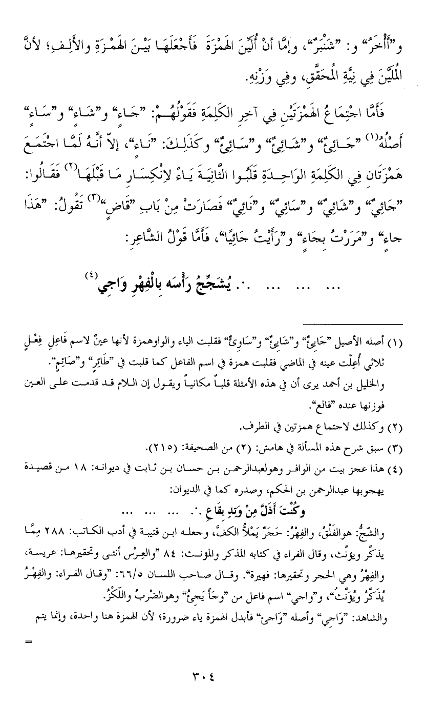 فأمّا اجتماع الهمزتين في آخر الكلمة فقولهم: "جاءٍ" و"شاءٍ" و"ساءٍ" أصله "جائِيٌ" و"شائِيٌ" و"سائِيٌ" وكذلك "ناءٍ" إلاّ أنّه لمّا اجتمع همزتان في الكلمة الواحدة قلبوا الثانية ياءً لانكسار ما قبلها فقالوا: "جائِيٌ" و"شائِيٌ" وسائِيٌ" و"نائِيٌ" فصارت من باب "قاضٍ" تقول: "هذا جاءٍ" و"مررت بجاءٍ" "ورأيت جائيًا"، فأمّا قول الشّاعر: