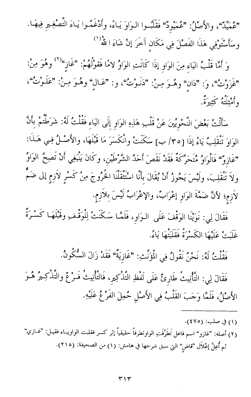 سألت بعض النّحويّين عن قلب هذه الواو إلى الياء فقلت له: شرطتم بأنّ الواو تنقلب ياءً إذا سكنت وانكسر ما قبلها، والأصل في هذا: "غازِوٌ" فالواو متحرّكة فقد نقص أحد الشّرطين، وكان ينبغي أن تصحَّ الواو ولا تنقلب، وليس يجوز أن يقال بأنّا استثقلنا الخروج من كسر لازم إلى ضمٍّ لازم، لأنّ ضمّة الواو إعرابٌ، والإعراب ليس بلازم.