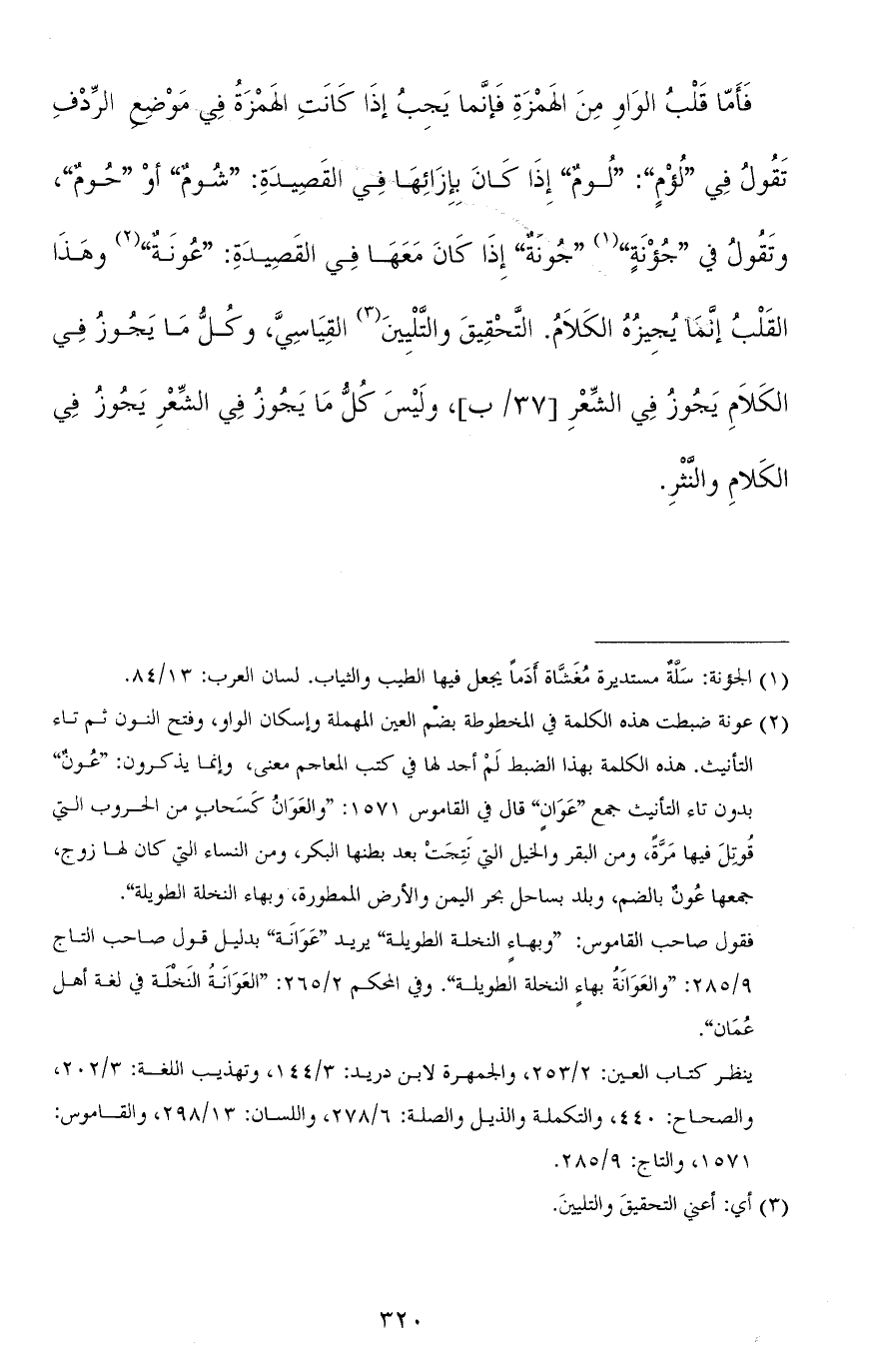 فأمّا قلب الواو من الهمزة فإنّما يجب إذا كانت الهمزة في موضع الرِّدْف تقول في "لُؤْمٍ": "لُومٍ" إذا كان بإزائها في القصيدة: "شُومٌ" أو "حُومٌ"، وتقول في "جُؤْنَةٍ" "جُونةٌ" إذا كان معها في القصيدة: "عُونَةٌ" وهذا القلب إنّما يجيزه الكلام. التّحقيقَ والتّليينَ (¬1) القياسيَّ، وكلُّ ما يجوز في الكلام يجوز في الشّعر، وليس كلّ ما يجوز في الشّعر يجوز في الكلام والنّثر.