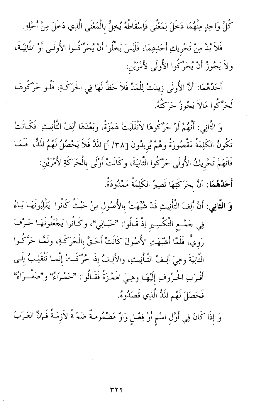 والثاني: أنّ ألف التّأنيث قد شُبِّهت بالأصول من حيث كانوا يقلبونها ياء في جمع التّكسير إذ قالوا: "حَبالِي" وكانوا يجعلونها حرف رَوِيٍّ، فلمّا أشبهت الأصول كانت أحقّ بالحركة، ولمّا حرّكوا الثّانية وهي ألف التّانيث، والألف إذا حرّكت إنّما تنقلب إلى أقرب الحروف إليها وهي الهمزة فقالوا: "حمراءُ" و"صَفراءُ" فحصل لهم المدُّ الذي قصدوه.