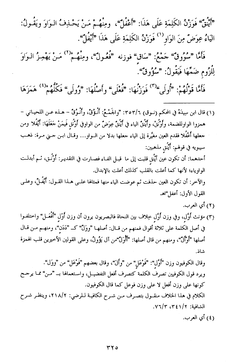 "أيْنُقٌ" فوزن الكلمة على هذا: "أعْفُلٌ"، ومنهم من يحذف الواو ويقول: الياء عوض من الواو فوزن الكلمة على هذا "أيْفُلٌ".