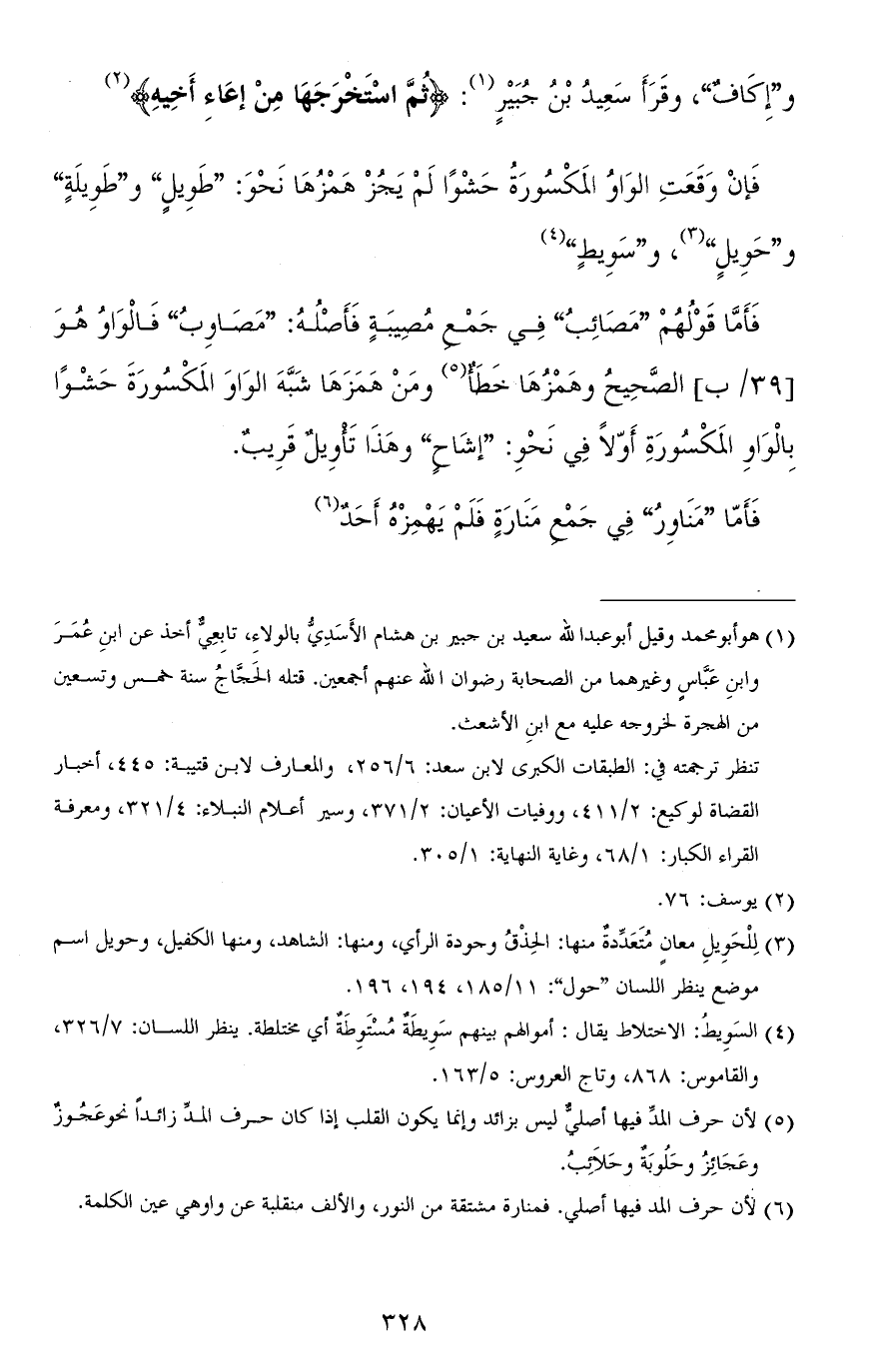 فأمّا قولهم "مصائِبُ" في جمع "مُصيبة" فأصله: "مَصاوِبُ" فالواو هو الصّحيح وهمزها خطأ ومن همزها شبّه الواو المكسورة حشوًا بالواو المكسورة أوّلاً في نحو: "إشاح" وهذا تأويل قريب.