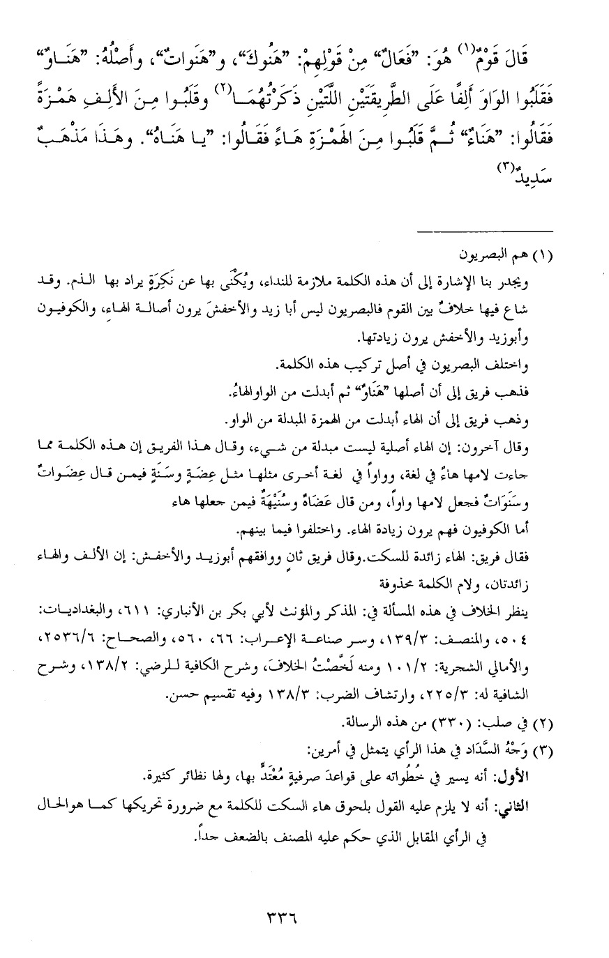 قال قوم: هو "فَعالٌ" من قولهم: "هَنُوكَ"، و"هَنَواتٌ"، وأصله: "هَناوٌ" فقلبوا الواو ألفًا على الطّريقتين اللّتين ذكرتهما وقلبوا من الألف همزة فقالوا: "هَناءٌ" ثمّ قلبوا من الهمزة هاء فقالوا: "يا هَناهُ". وهذا مذهب سديد.