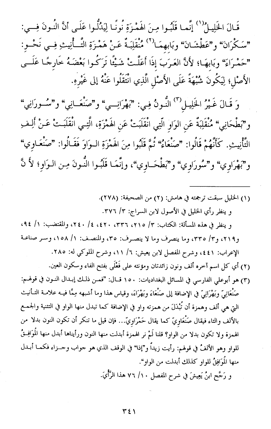 وقال غير الخليل النّون في "بَهْراني" و"صَنْعانِي" و"سُورانِي" و"بَطْحانِي" منقلبة عن الواو التي انقلبت عن الهمزة، التي انقلبت عن ألف التّأنيث. كأنّهم قالوا: "صنعاء" ثم قلبوا من الهمزة الواو فقالوا: "صَنْعاوِي" و"بَهْراوِي" و"سُوراوِي" و"بَطْحاوِي"، وإنّما قلبوا النّون من الواو، لأنّ