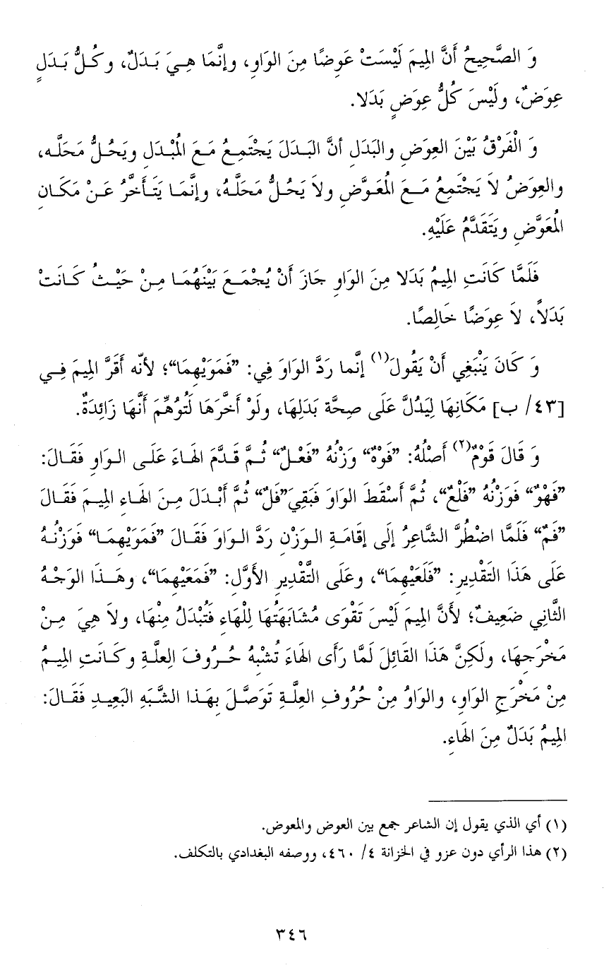 والصّحيح أنّ الميم ليست عوضًا من الواو، وإنّما هي بدلٌ، وكلّ بدل عوضٌ، وليس كلّ عوضٍ بدلا.