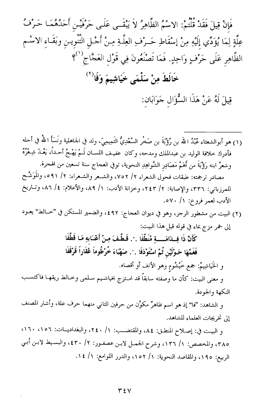 فإن قيل فقد قلتم: الاسم الظّاهر لا يبقى على حرفين أحدهما حرف علّة لما يُؤدّي إليه من إسقاط حرف العلّة من أجل التّنوين وبقاء الاسم الظّاهر على حرف واحد. فما تصنعون في قول العجّاج؟