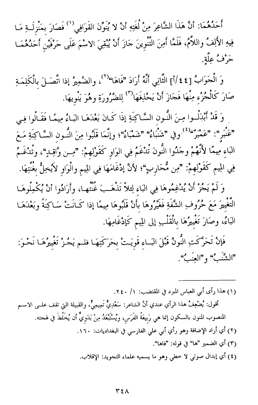 وقد أبدلوا من النّون السّاكنة إذا كان بعدها الباء ميمًا فقالوا في "عَنْبَر": "عَمْبَر". وفي "شَنْباء" "شَمْباء"؛ وإنّما قلبوا من النّون السّاكنة مع الباء ميمًا لأنّهم وجدوا النّون تدغم في الواو كقولهم: "من وّاقد"، وتدغم في الميم كقولهم: "مِن مُّحارب"، لأنّ إدغامها في الميم والواو لا يخلُّ بغنّتها.