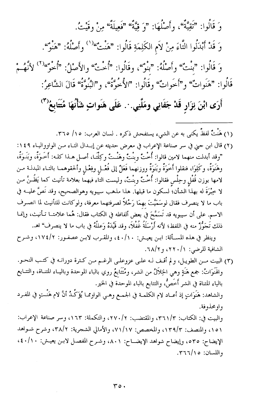 وقالوا: "بِنْتٌ" وأصله: "بِنْوٌ"، وقالوا: "أخْتٌ" والأصل: "أخْوٌ" لأنّهم قالوا: "هَنَواتٌ" و"أخواتٌ" وقالوا: "الأُخُوَّةُ"، و"البُنُوَّةُ" قال الشّاعر: