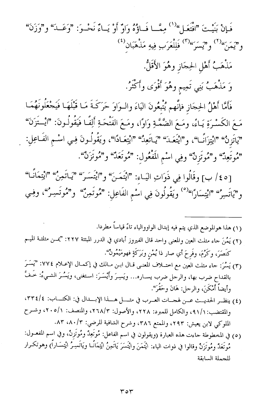 وقالوا في ذوات الياء: "ايْتَمَنَ" و"ايْتَسَرَ" "ياتَمِنُ" "ايْتِمانًا" و"ياتَسِرُ" "ايْتِسارًا" ويقولون في اسم الفاعل: "موتَمِنٌ" و"مُوتَسِرٌ"، وفي