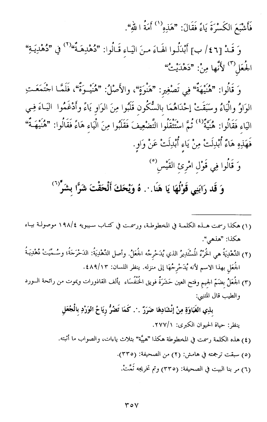 وقالوا: "هُنَيْهَةٌ" في تصغير "هَنْوَةٍ"، والأصل: "هُنَيْوَةٌ"، فلمّا اجتمعت الواو والياء وسبقت إحداهما بالسّكون قلبوا من الواو ياء وأدغموا الياء في الياء فقالوا: هُنَيَّةٌ ثم استثقلوا التّضعيف فقلبوا من الياء هاء فقالوا: "هُنَيْهَة" فهذه هاءٌ أبدلت من ياء أبدلت عن واو.