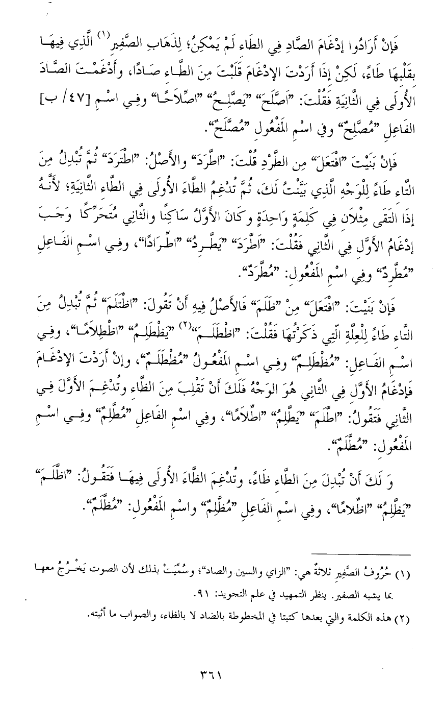 فإن أرادوا إدغام الصّاد في الطّاء لم يمكن، لذهاب الصّفير الذي فيها بقلبها طاء، لكن إذا أردت الإدغام قلبت من الطّاء صادًا، وأدغَمْتَ الصّاد الأولى في الثّانية فقلت: "اصَّلَحَ" "يَصَّلِحُ" "اصِّلاحًا" وفي اسم الفاعل "مُصَّلِحٌ" وفي اسم المفعول "مُصَّلَحٌ".
