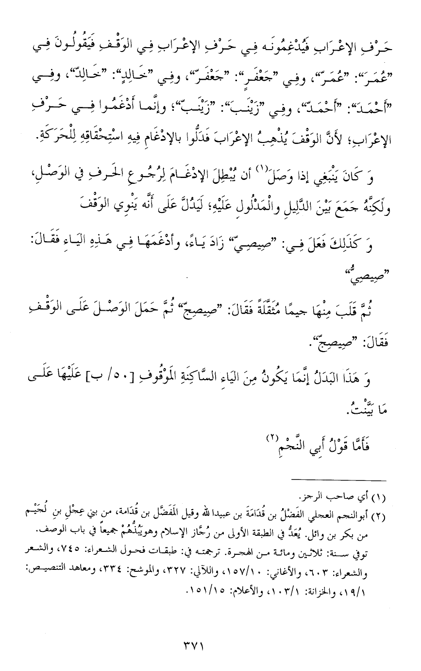 حرف الإعراب فيدغمونه في حرف الإعراب في الوقف فيقولون في "عمرَ": "عُمَرّ"، وفي "جعفرٍ": "جعفرّ"، وفي "خالدٍ": "خالدّ"، وفي "أحمدَ": "أحمدّ"، وفي "زينب": "زينبّ"؛ وإنّما أدغموا في حرف الإعراب، لأنّ الوقف يذهب الإعراب فدلّوا بالإدغام فيه استحقاقه للحركة.