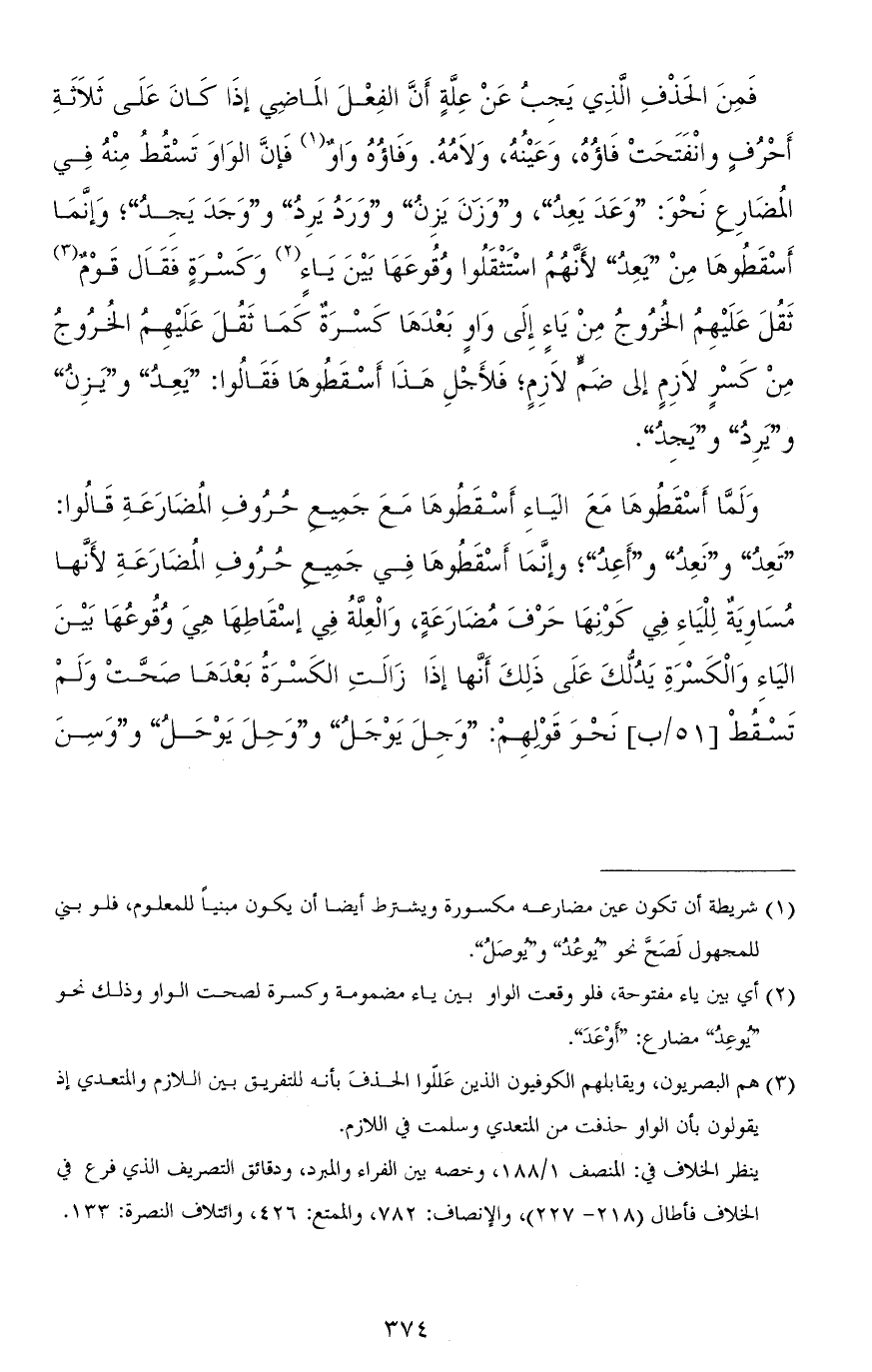 فمن الحذف الذي يجب عن علّة أنّ الفعل الماضي إذا كان على ثلاثة أحرف وانفتحت فاؤه، وعينه، ولامه. وفاؤه واو فإنّ الواو تسقط منه في المضارع نحو: "وَعَدَ يَعِدُ"، و"وَزنَ يَزِنُ" و"وَرَدَ يَرِدُ" و"وَجَدَ يَجِدُ"؛ وإنّما أسقطوها من "يَعِدُ" لأنّهم استثقلوا وقوعها بين ياء وكسرة فقال قوم ثقل عليهم الخروج من ياء إلى واو بعدها كسرة كما ثقل عليهم الخروج من كسر لازم إلى ضمّ لازم، فلأجل هذا أسقطوها فقالوا: "يَعِدُ"، و"يَزِنُ" و"يَرِدُ" و"يَجِدُ".