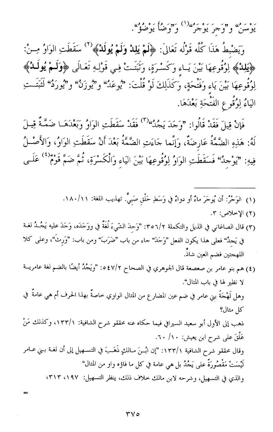ويضبط هذا كلّه قوله تعالى: (لم يلد ولم يولد) سقطت الواو من (يلد) لوقوعها بين ياء وكسرة، وثبتت في قوله تعالى (ولم يولد) لوقوعها بين ياء وفتحة، وكذلك لو قلت: "يُوعَدُ" و"يُوزَنُ" و"يُورَدُ" لثبتت الياء لوقوع الفتحة بعدها.
