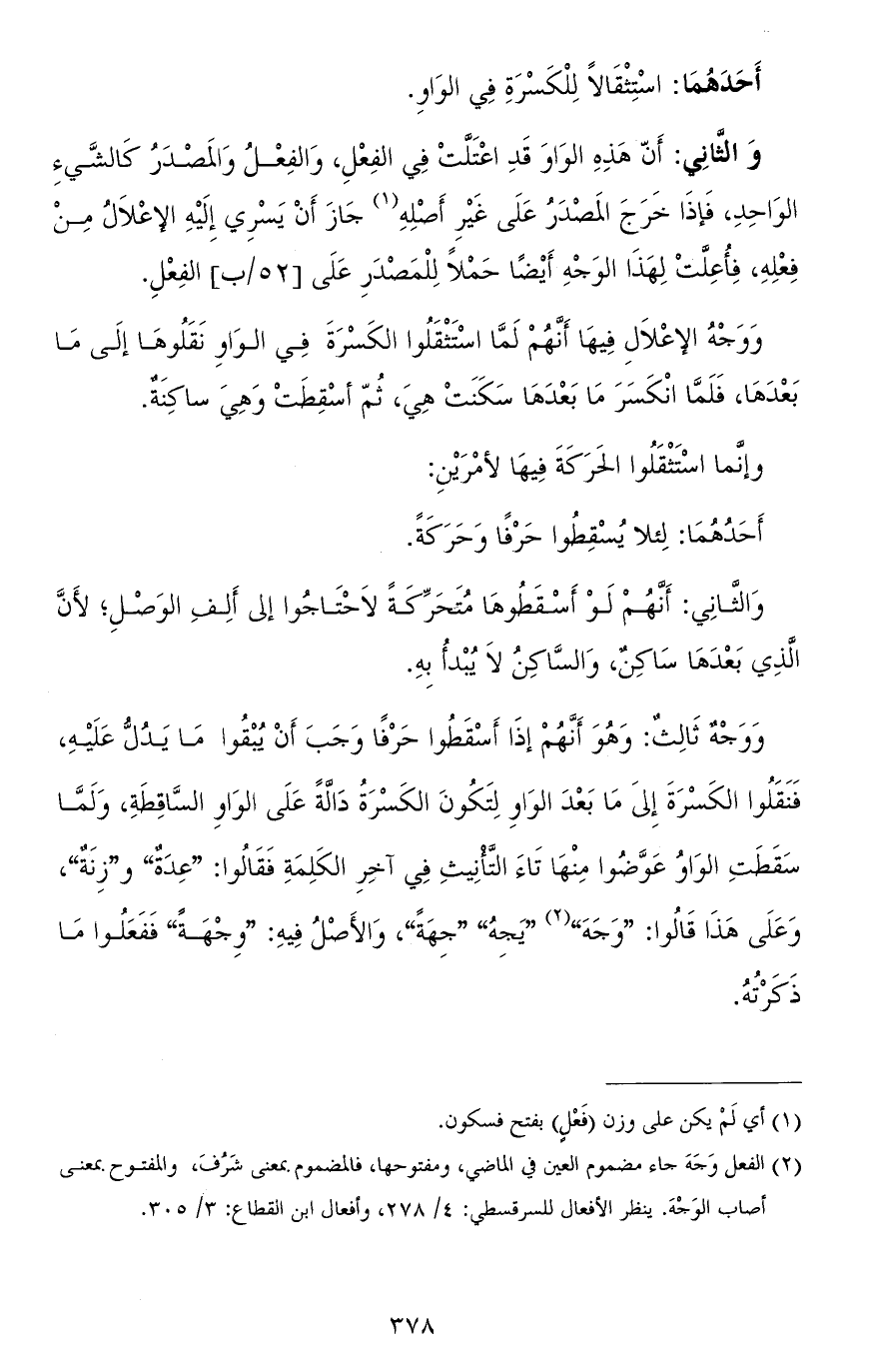ووجه ثالث: وهو أنّهم إذا أسقطوا حرفًا وجب أن يبقوا ما يدلّ عليه، فنقلوا الكسرة إلى ما بعد الواو لتكون الكسرة دالّة على الواو السّاقطة، ولمّا سقطت الواو عوّضوا منها تاء التأنيث في آخر الكلمة فقالوا: "عِدَة" و"زِنَة"، وعلى هذا قالوا: "وَجَهَ" "يَجِهُ" "جِهَةً"، والأصل فيه: "وِجْهَة" ففعلوا ما ذكرته.